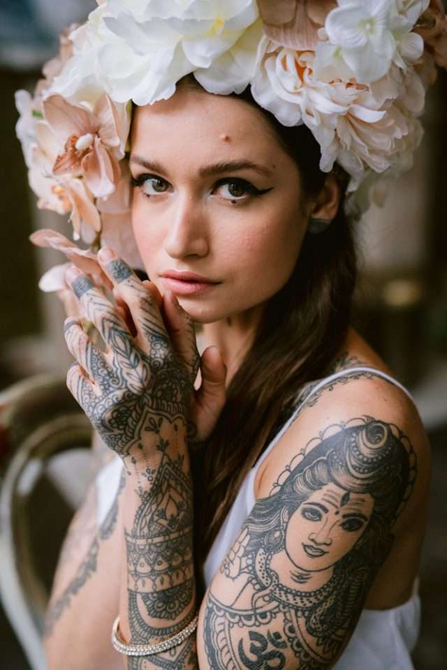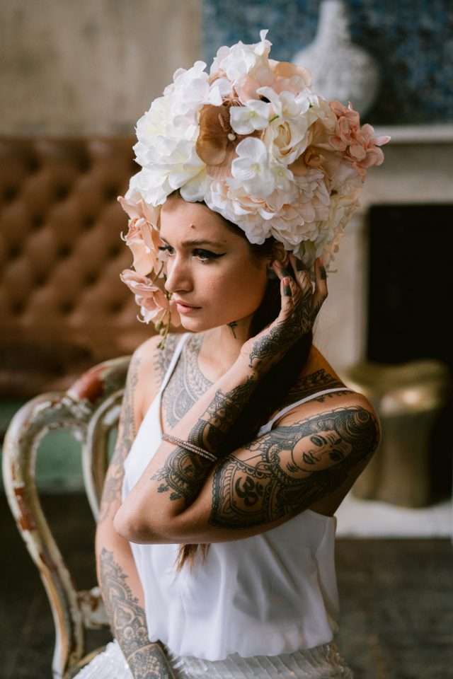 Nothing screams Rock n Roll Bride more than a short, 50s style dress and this stunner looks incredible in person! The all-over lace dress features a high/ low style skirt, a removable embellished belt and a flattering sweetheart neckline. The unlined lace sleeves will allow your tattoos to shine through with pride!