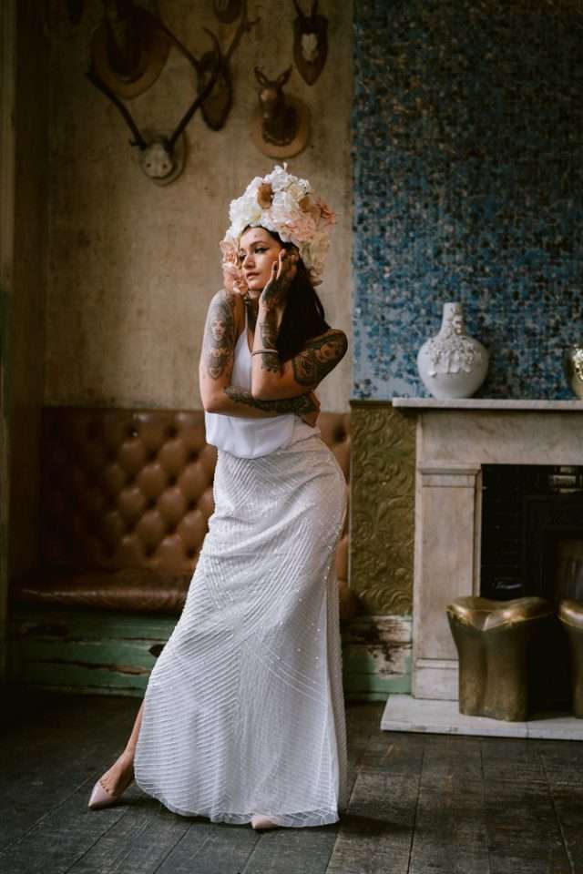 This two-piece set is perfect for the laid back, boho bride. Featuring a gently draped floor-length skirt in a lightweight chiffon, it’s comfortable to wear and includes satin covered button detail at the back, a concealed zip fastening and satin lining.