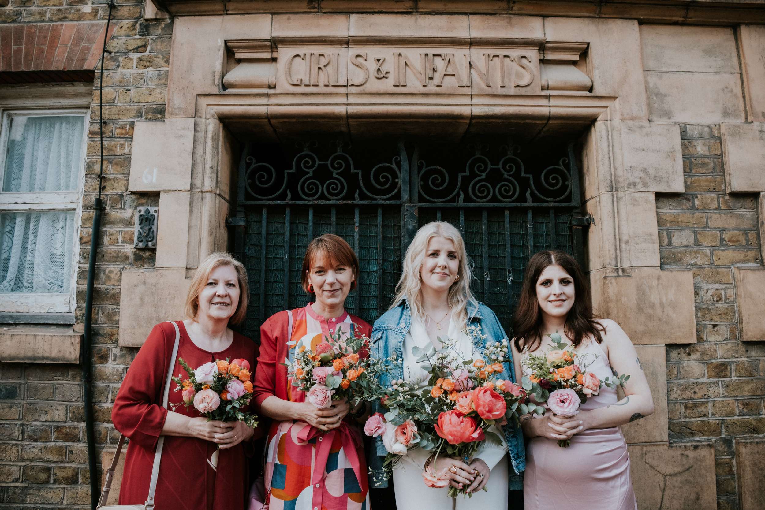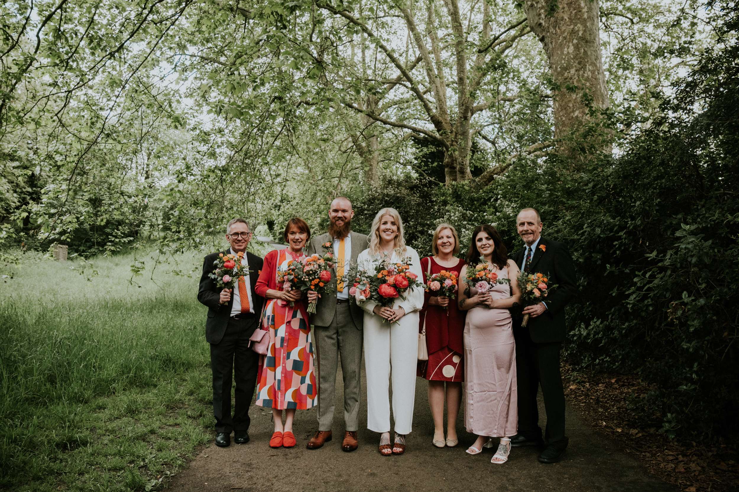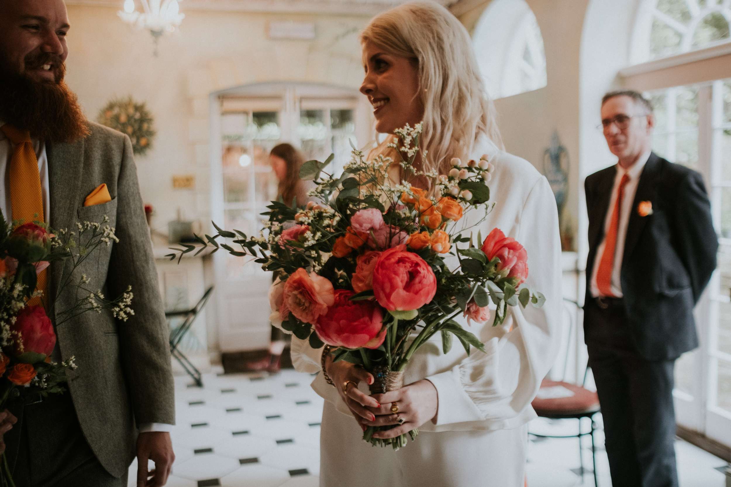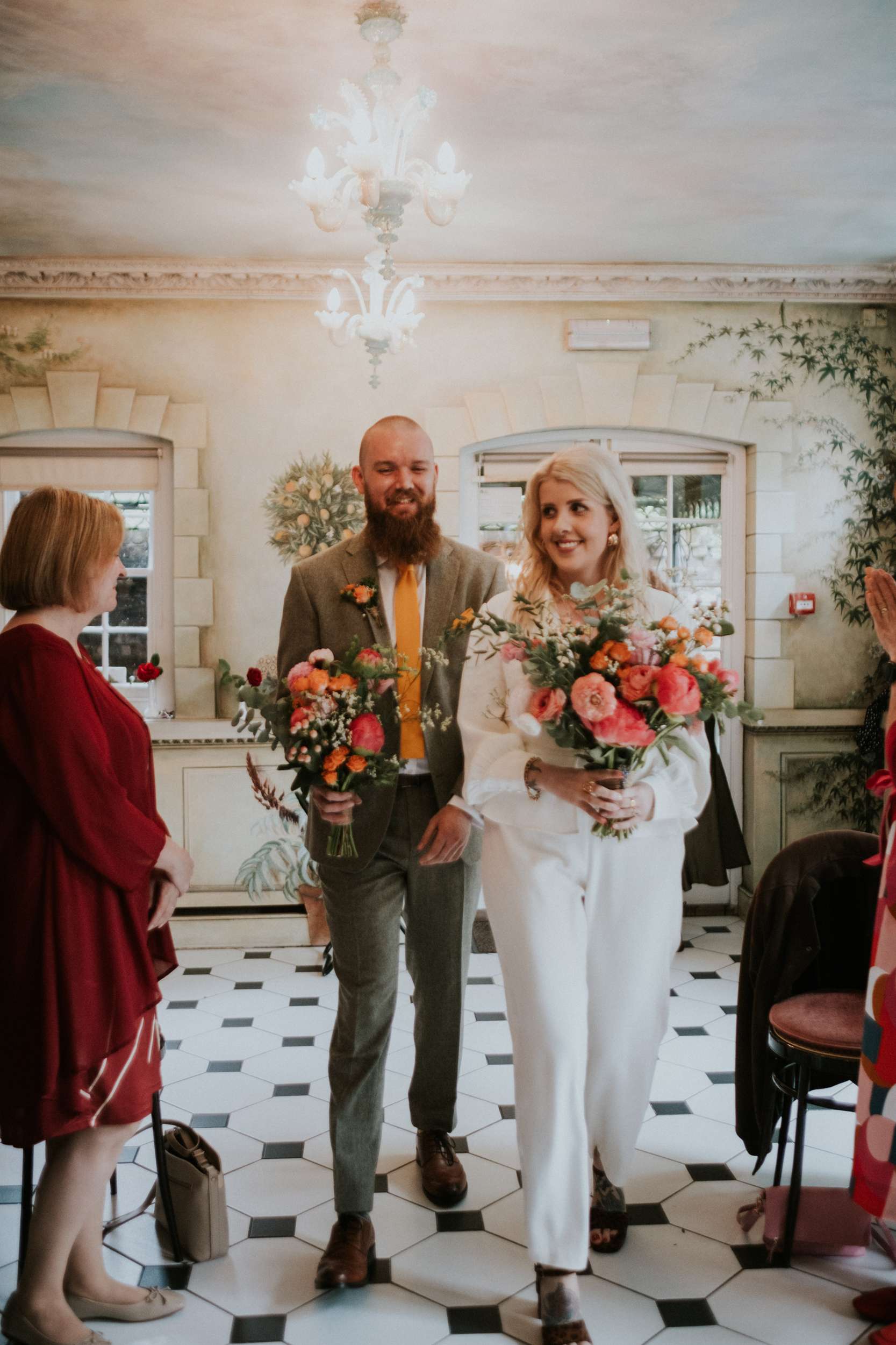 The day began with everyone taking a flower-making class in the morning and making their own bouquets! Katie explains, “I love flowers and I feel my most beautiful when I’m carrying them – sometimes I just go to M&S to buy a bunch of flowers and then walk the long way home with them, haha! I wanted all of our guests to have that same feeling. We all made our own bouquets from a selection of stems that I chose, and I love the look of the photos with everyone carrying flowers, as it’s quite unusual for people who aren’t the bride or bridesmaid to have flowers. I attached a blue brooch to my bouquet that had been given to my mother-in-law on her wedding day, to add something sentimental (and blue!).”