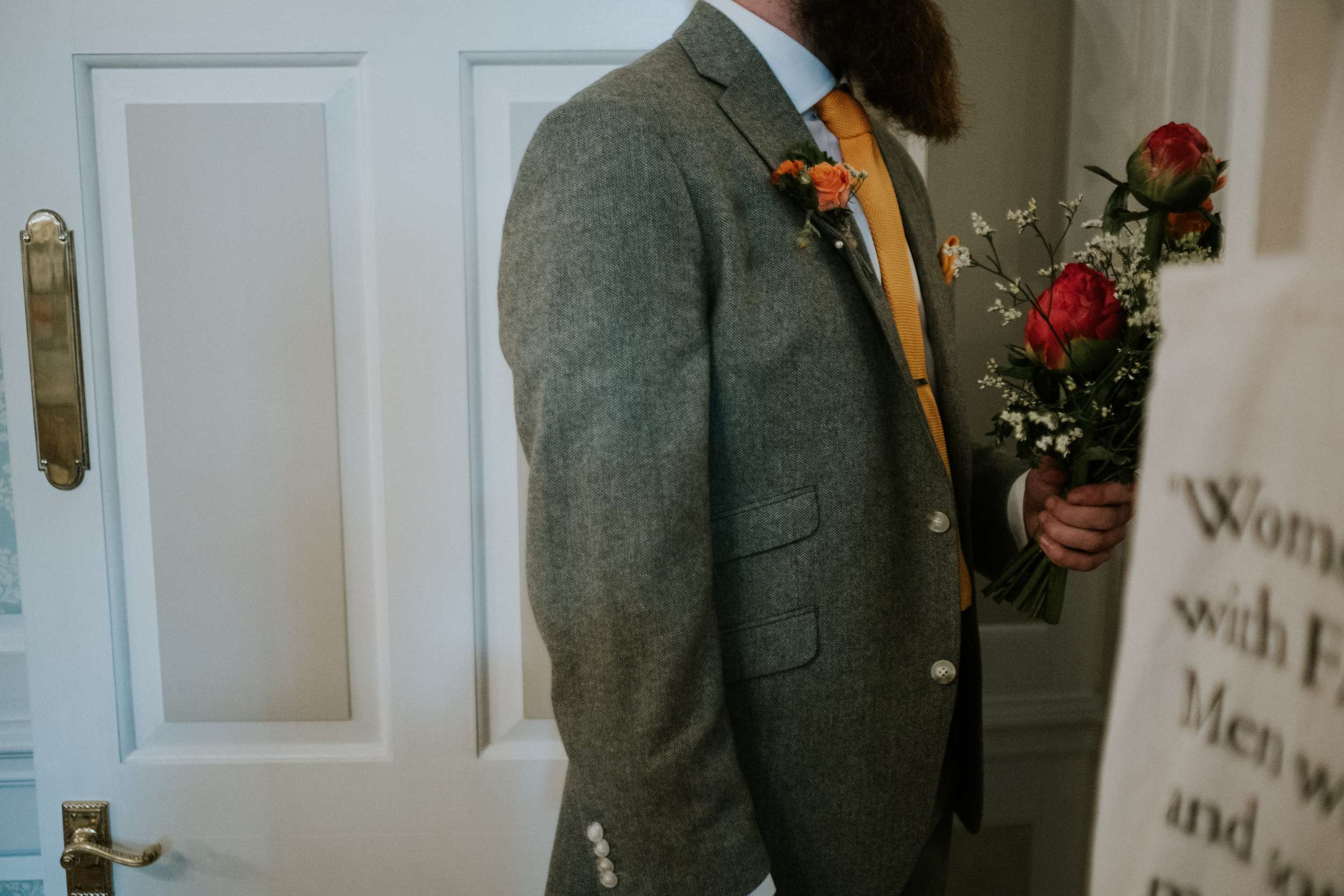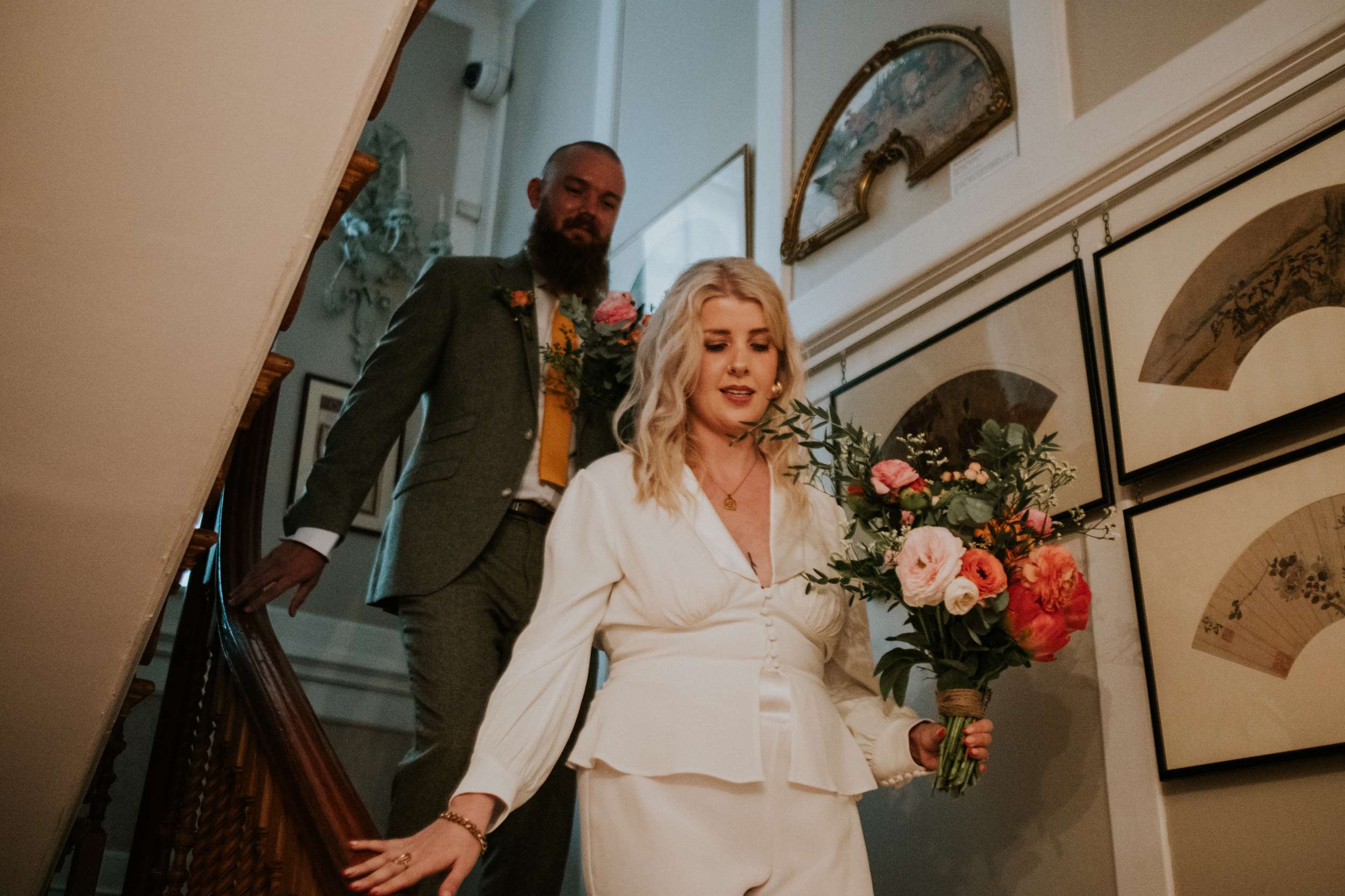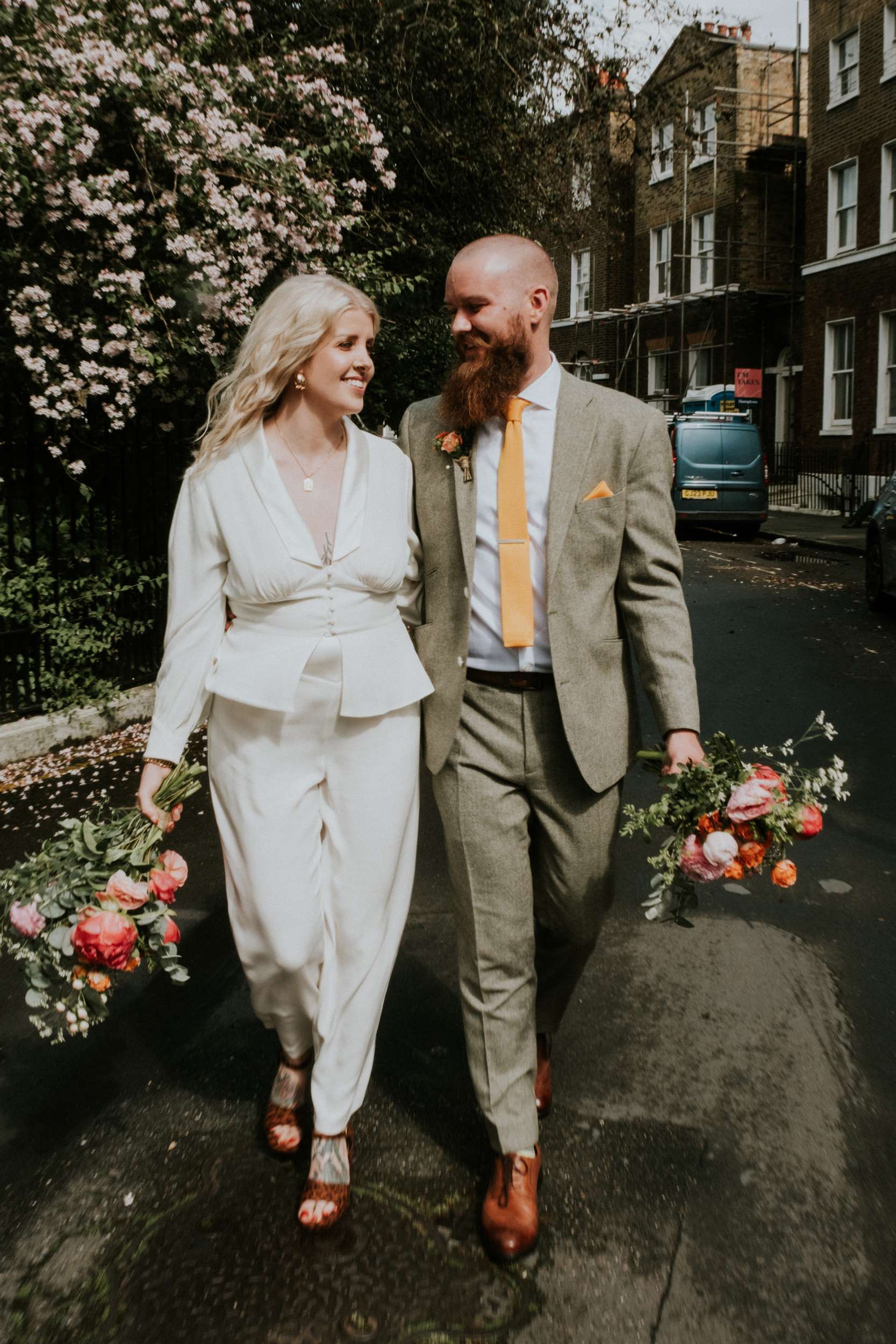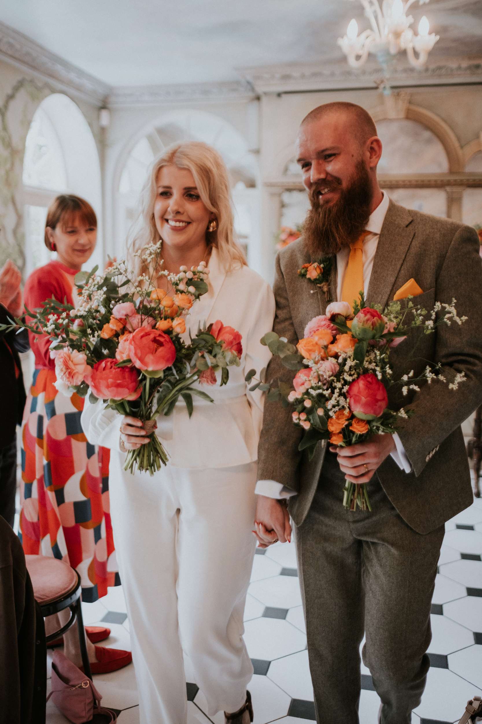 The day began with everyone taking a flower-making class in the morning and making their own bouquets! Katie explains, “I love flowers and I feel my most beautiful when I’m carrying them – sometimes I just go to M&S to buy a bunch of flowers and then walk the long way home with them, haha! I wanted all of our guests to have that same feeling. We all made our own bouquets from a selection of stems that I chose, and I love the look of the photos with everyone carrying flowers, as it’s quite unusual for people who aren’t the bride or bridesmaid to have flowers. I attached a blue brooch to my bouquet that had been given to my mother-in-law on her wedding day, to add something sentimental (and blue!).”