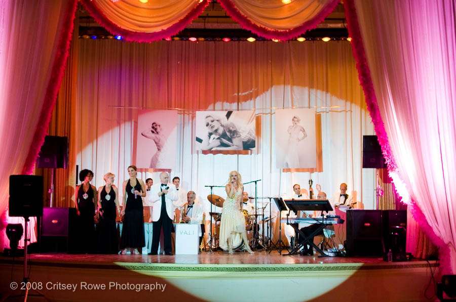 This wedding was featured on a TV show (which unfortuantly I haven’t been able to see) Apparatnyl the Bride wanted things very different to the norm. The show brought in an expert who was supposed to “class things up”. They air brushed over her tattoos, and made her choose a different dress and bridesmaid dresses. She wanted a cake with a giant cupcake and spiders- and he said no way! The Bride actually works as a Marilyn impersonator (hence the singing) and to top it all off the show paid for the whole thing!
