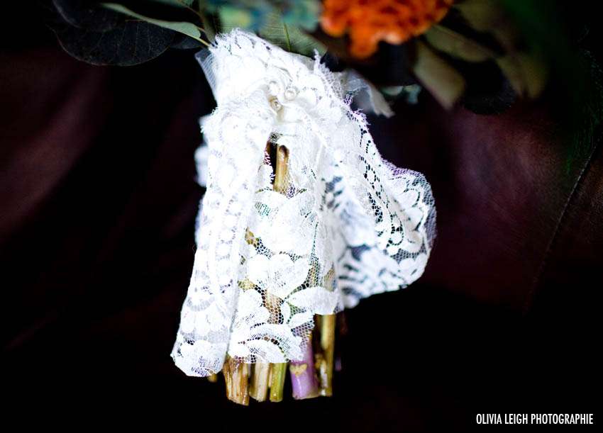 I have a new, ever growing obsession with this colour green and peacock feathers and this wedding satisfys that! This wedding also features quite possiblly one of the coolest and most original bouquets I’ve seen – I want one! Sam’s beautiful dress used lace from her mother’s wedding mantilla, and they also tied a bit of it around the bouquet. It was designed and made by Dame Couture.