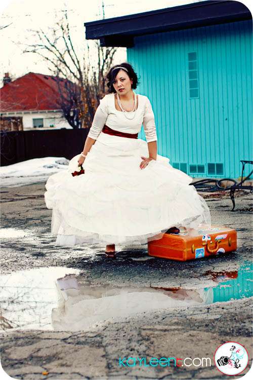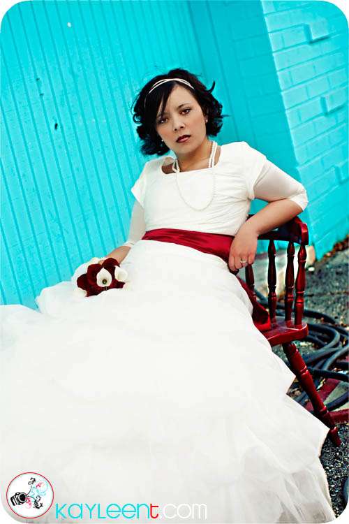 Shot by Utah photographer Kayleen T, these fierce images show this Bride at her sexiest – hot red shoes, that brilliant ‘reflection in the puddle thing’ and the amazing turquoise wall –  just fabulous!