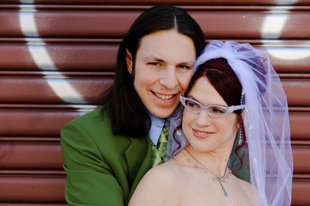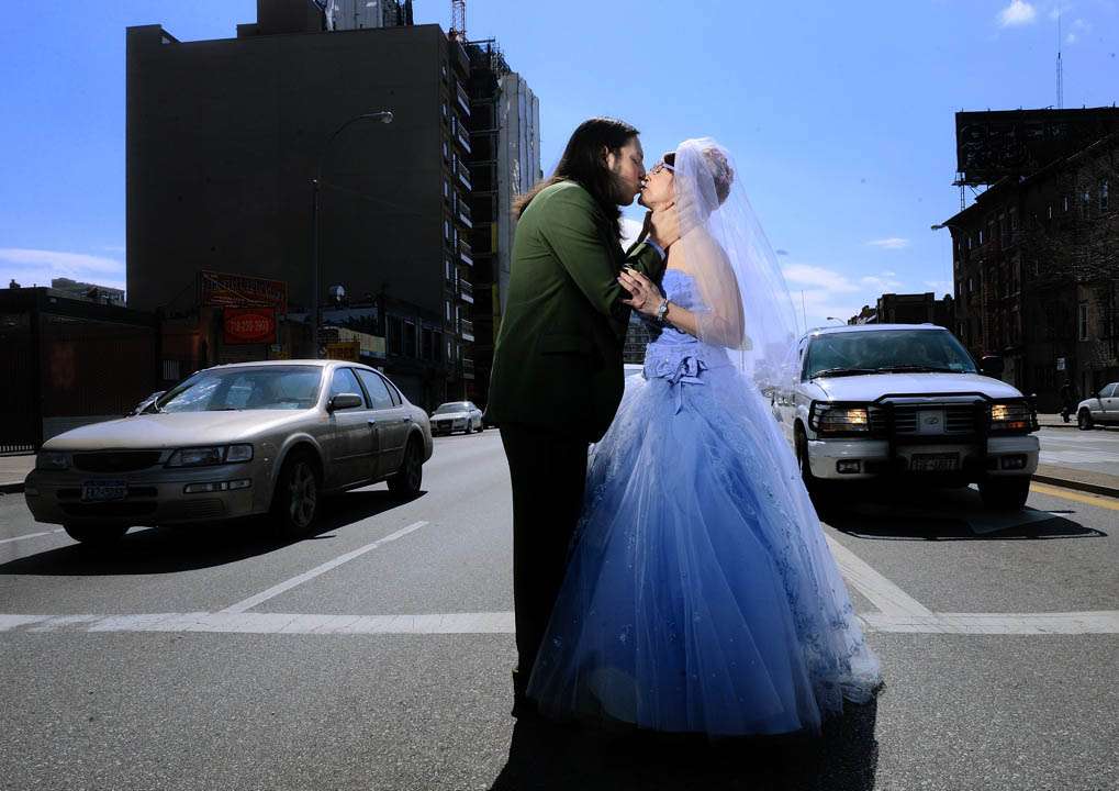 Who could be more fitting of a rock ‘n’ roll couple than groom who owns an indie record label? I have never heard wedding music like this, from booked bands to guests getting up and jamming … and actually being astonishingly good. Then you add that the couple are bot professional artists, she wore periwinkle, he wore olive, they made their own rings, and even constructed the wedding venue out of a rock venue, the Brooklyn Lyceum!