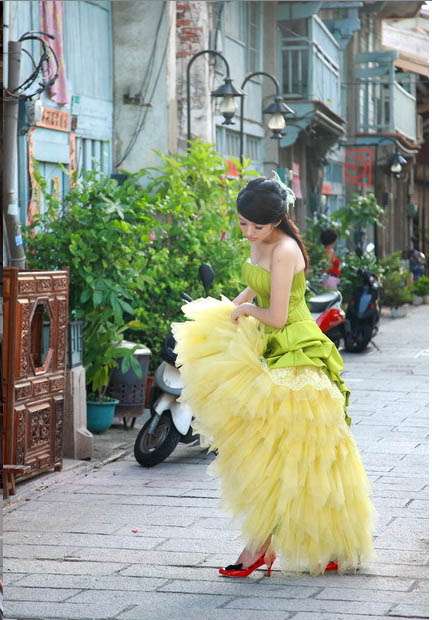 Glorious Kat June 1, 2009 Continuing the Long Sir love fest with this glorious green dress Bride…it was the tulle and the red show combo that did it for me. The GalleryBlog itBlog itBlog itBlog itBlog itBlog itBlog it Credit: Long Sir #Colourful Wedding Dress#Outdoors#Tulle
