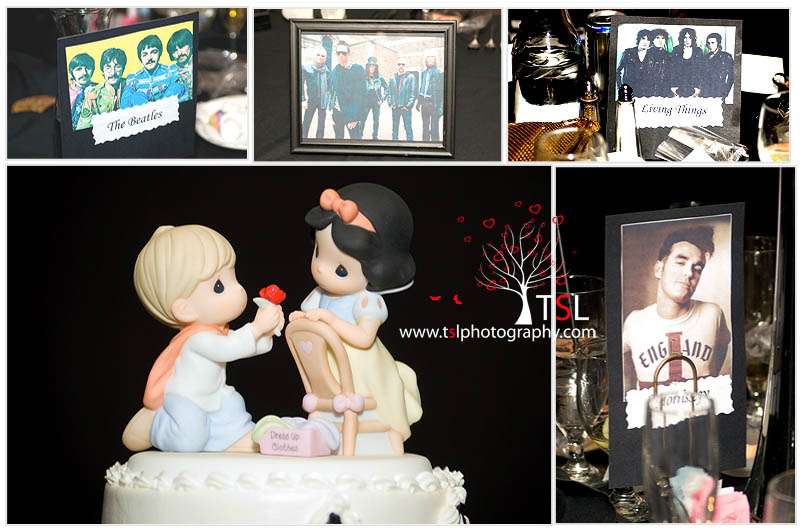 A Snow White Bride with a guitarist Groom who met at a Velvet Revolver concert is defiantly the kind of wedding I like. The couple went for a pin up/rock themed bash and the drummer of the band that brought them together even designed the Groom’s suit!