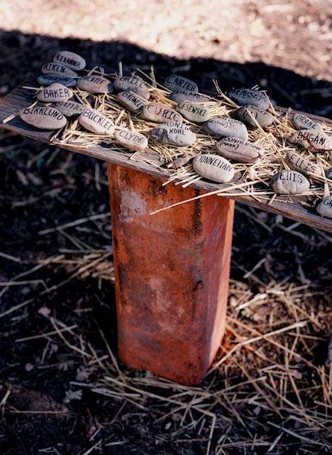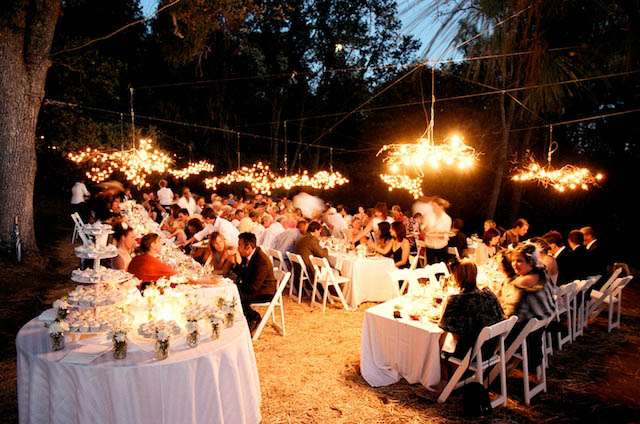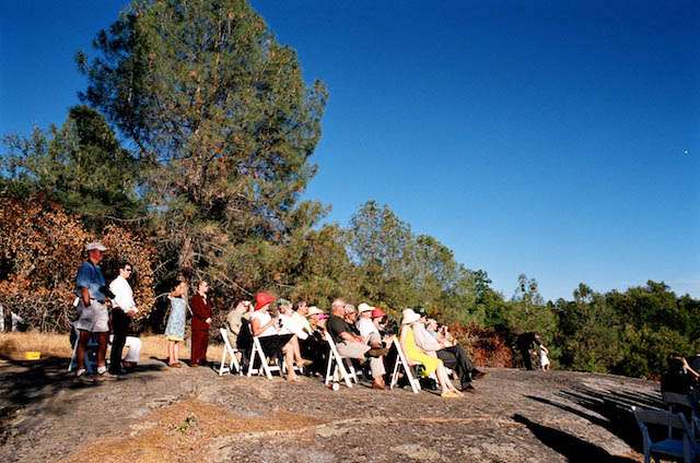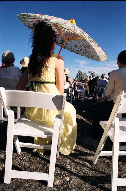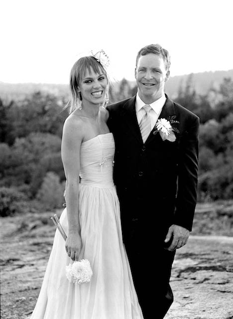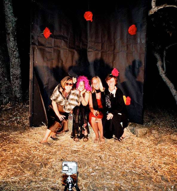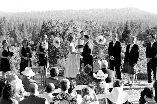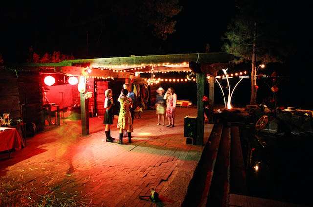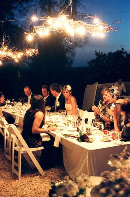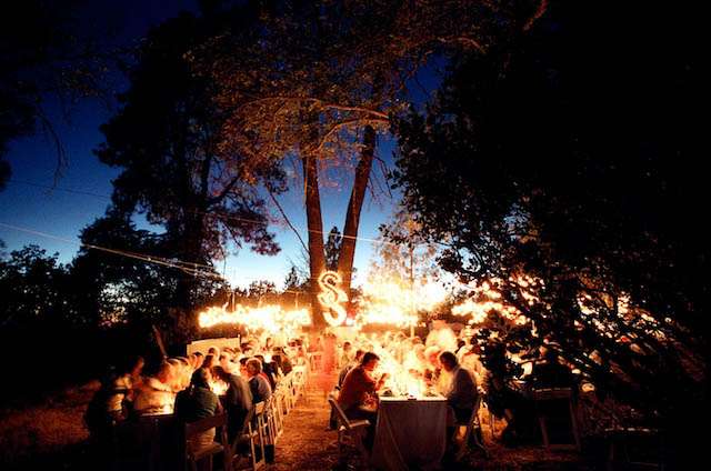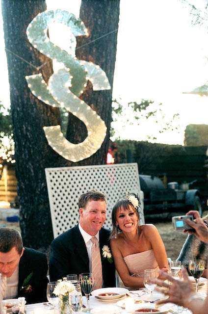 Susan and Scheffer Ely (they already sound like rock stars!) got married at a property outside of the town of Mariposa (which is on the way to Yosemite). The couple did tons of work on the property and totally DIY’ed the lot. They did all of the adorable flowers in the trees, made the chandeliers over the dining area out of Manzanita branches and they even constructed a flame burning giant flower sculptures that decorated the pool area! They also had a self-portrait photo area where guests could dress up in costumes and take their photo.