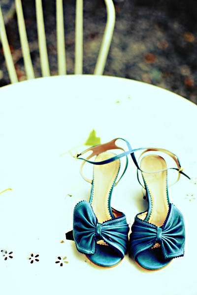 My dress was designed by me with the help of my friend, Rose Baron who made the dress. My vision for my dress was 70s inspired with long, soft sleeves and an empire waist. I did not want to wear white so we found this great dove grey cotton voile swiss dot fabric at Mood that I loved. I wanted some pleating detail on the center back and Rose really brought my vision to life! My headpiece was designed by me and made by my friend, Jenny. My blue shoes were Chloe. Rollie’s suit was from Banana Republic and his tie I bought at a vintage store in Rome.