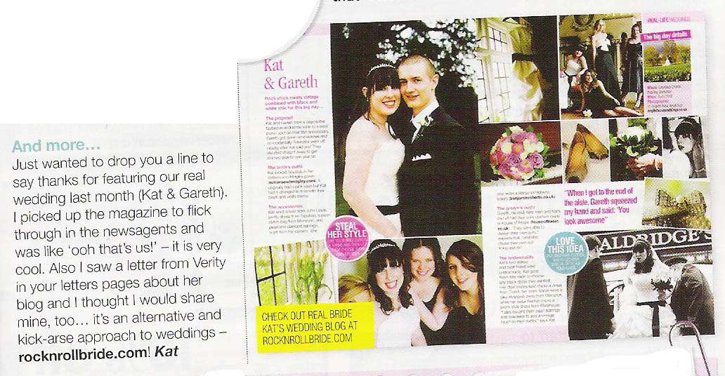 Just wanted to drop you a line to say thanks for featuring our real wedding last month (Kat & Gareth). I picked up the magazine to flick through in the newsagents and was like ‘ooh that’s us!’ – it is very cool. Also I saw a letter from Verity in your letters page about her blog and I thought I would share mine too..it’s an alternative and kick-arse approach to weddings – rocknrollbride.com!