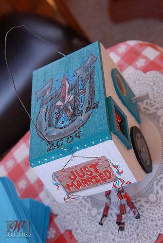 Jenn made her own veil and fascinator, the invitations, her bouquet, the boutonnieres, the cake, the decorations and the signs. Skip made his own Groom’s cake – a bowling ball and pins – and helped Jenn wherever she needed it! Jenn’s sister and maid of honour made all the cute cupcakes and each Bridesmaid maid their own fascinators. The couple decided not to include anybody in their wedding that they didn’t know – so they had a friend perform the ceremony and other friends chip in with food, hair and make up.