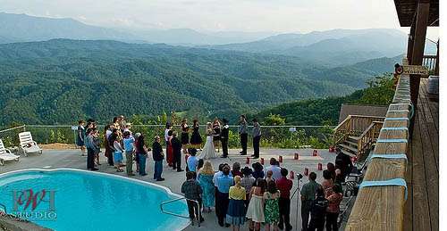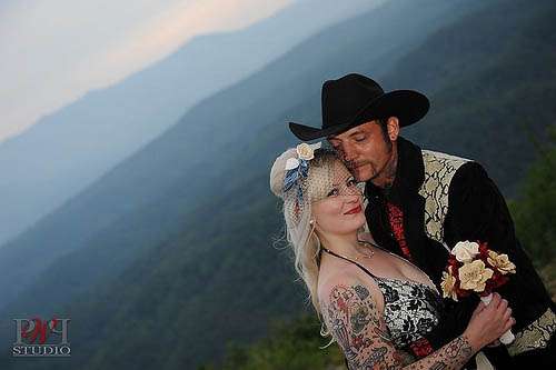 I am obsessed with themed things, so naturally the wedding had to have a theme. Our overall theme was “vintage vacation”. From there we had mini-themes inside the big one. The brides cake and cupcakes were woodland (to go with the mountains). The suggested attire was western. The groomsmen and Dads wore western shirts. The bridesmaids wore headpieces and carried fans, saloon girl style. Both the bride and groom wore cowboy boots (which we already owned)… the groom also had spurs, the hat, the whole shebang! Our favors were vacation & western themed, as well as our decorations, popcorn & candy bar.