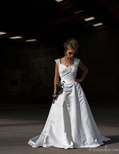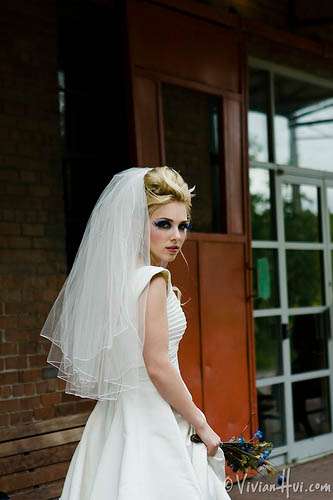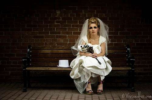 The shoot can be described as my attempt to take a whimsical, expect the unexpected, approach to what we normally think of when we think of a typical bride, what she should be wearing and what she should look like, etc. For example we had this gown that looks like it was straight from the 80’s contrasted with perfectly styled up hair. The bride is fully made-up but in crazy colours that you would usually only see on a cabaret dancer. Even the backgrounds we chose, sitting on a haystack, waiting alone on a bench….imagery that causes the viewer to double-take and basically cause a reaction whether it be a laugh, confusion, wonder – that’s what we were aiming for!
