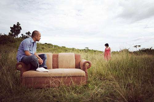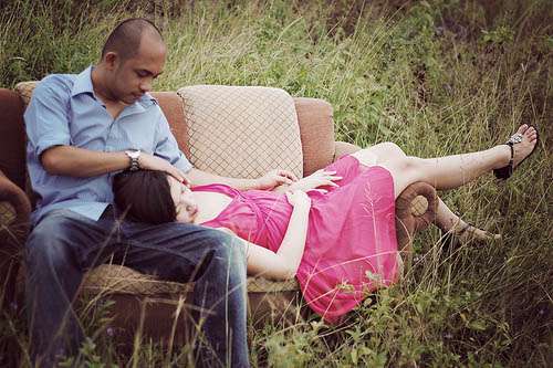 Cyrus & Kiss (I kid you not – cutest names ever!) had a ‘the world is our living room’ themed engagement shoot. Along with their photographers, they lugged a sofa (actually from the photographer’s house!) into the back of a truck and drove to their location. When they got there they only wished they had also brought the TV and maybe a lamp or two to complete the set!