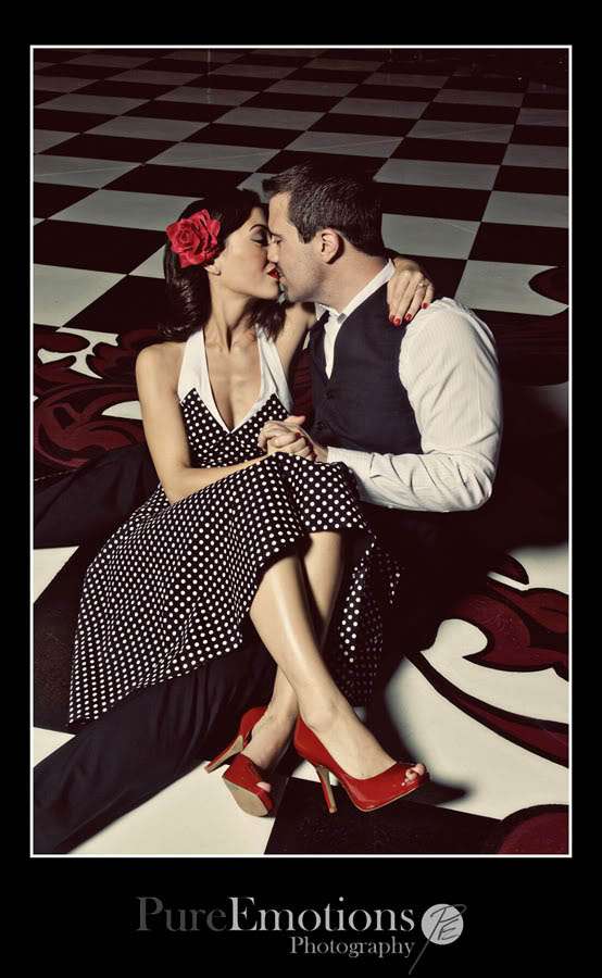 Classy, elegant, retro. These are the words that came to me as soon as I saw Rebecca & Justin’s 1950s inspired engagement session. The shoot took place at The Ritz Ybor in downtown Tampa, a venue which perfectly reflected photographer Alicia’s vision for the session. Rebecca’s polka dot dress was from PinUp Girl Clothing and Justin looked the part in his trilby hat (which retails at $75 but he picked up for $6!) and waistcoat combo.
