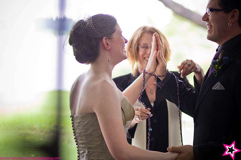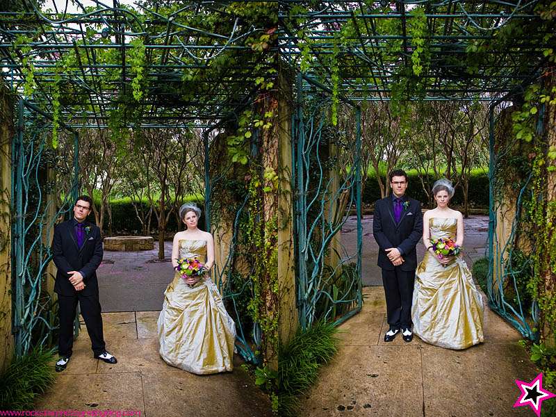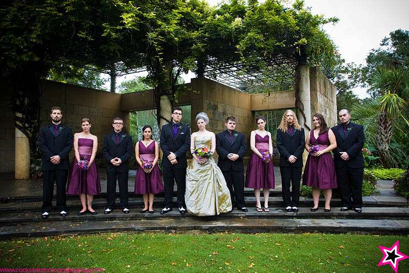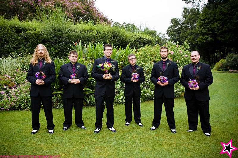 I think this year green may be the new colour de jour for rock n roll brides. I have been sent a couple of gorgeous green girlies recently…do I see a new trend emerging? You will probably remember Amy from her stunning bridals that I shared recently. Well photographer Brandi was nice enough to send me Amy & Aarons’s full wedding to report. I am crazy about the florals (I’ll probably never tire of peacock feather bouquets!), the bridesmaid’s and groomsmen’s awesome purple combos which looks fab against Amy… and still of course, her shoes!