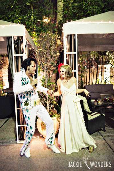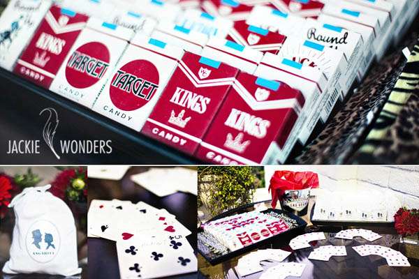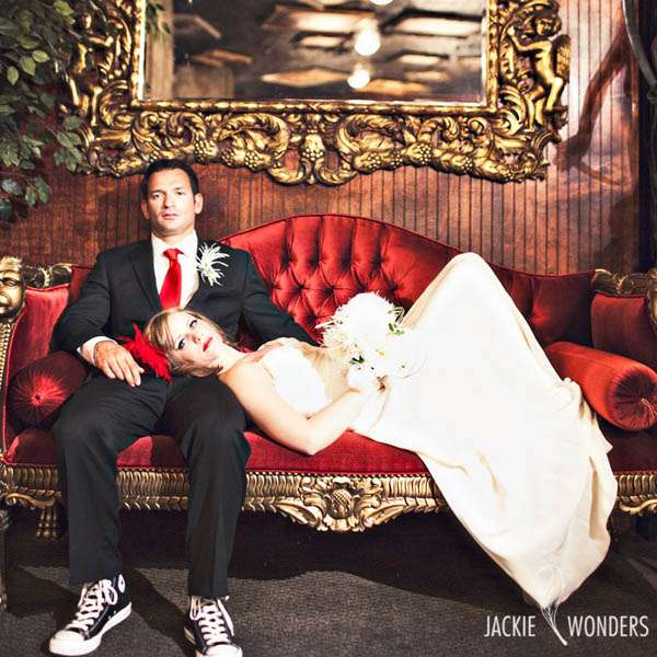 Carly is a graphic designer, so she handmade and designed out all of the details of the wedding, from the invites to the candy silhouette favor bags. There were even animal print slap bracelets for all the gals! They used playing cards as place cards with guests names on them and she handpicked each bridesmaid’s red and gold accessories and allowed them each to chose their own short, white dress. The guys got to wear a black suit with a tuxedo shirt and chucks 🙂