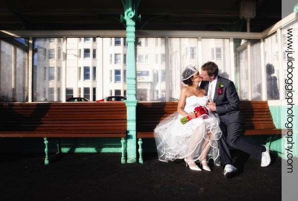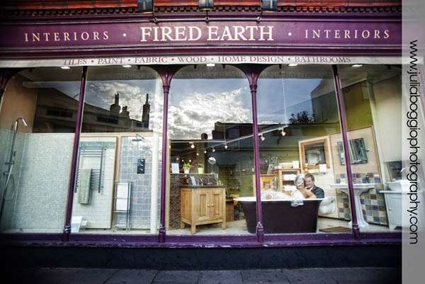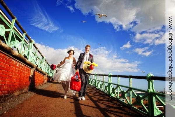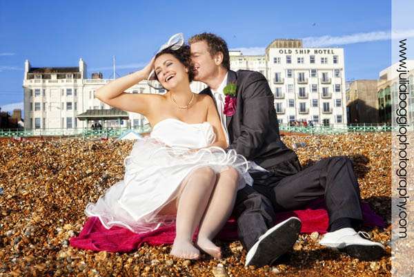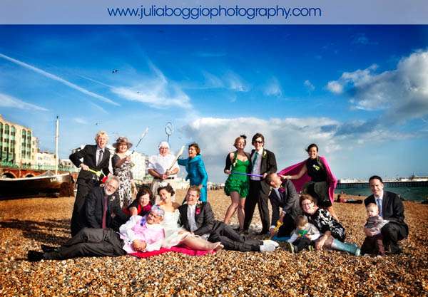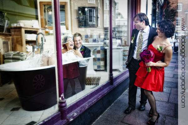 Andrew and Lisa got married in Brighton in October on a very sunny day at the Hotel Du Vin. The hotel held special significance for the bride because, when it was a pub many years ago, her grandparents used to leave her father as a boy sitting outside with a Coke and some chips to keep him busy while they had a pint with their mates. Thus the picture of her dad with the chips and the Coke! Good photography was extremely important to Andrew and Lisa, who is a graphic designer. Having seen some of my previous work, they had some ideas about stuff they’d like to do; for example, with one of my previous couples, I got them to stand in a shop window. Lisa and Andrew liked this so much that they asked a nearby shop if they could do the same thing. The image of them sitting in the bathtub in the Fired Earth window was the result. Also, for the group shot, they brought loads of props along so we could head down to the beach for some fun. His father cagily told us he would meet us down on the beach and disappeared for a bit. He found us fifteen minutes later, having changed into typical British beach-going wear, complete with hanky tied over his head. Everything about this wedding was great fun!