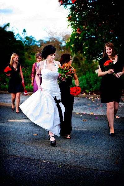 The groom and groomsmen all researched their family tartan and kilts were made with their family tartan. They also carried swords and daggers as part of their outfits Louise’s beautiful dress was by Winnie Bridal and the bridesmaid’s all purchased their own black dresses of their choice. The couple purchased their flowers from Brisbane market flowers. Louise carried a bouquet of bird of paradise and the bridesmaid carried gorgeous orange gerberas. The reception was held at the Summit Restaurant, Mt Coo-tha. Louise decorated the tables at the reception with gold fish in vases with floating orange gerberas and the wedding cake was made by Louise’s mother. Both Louise and Brett were fantastic throughout the day and Brett even managed to keep his cool with Louise being nearly half an hour late for the ceremony!