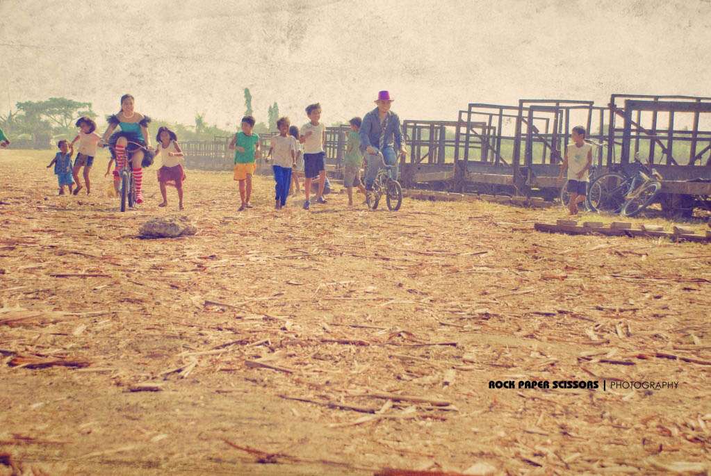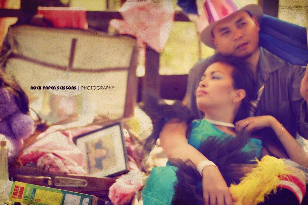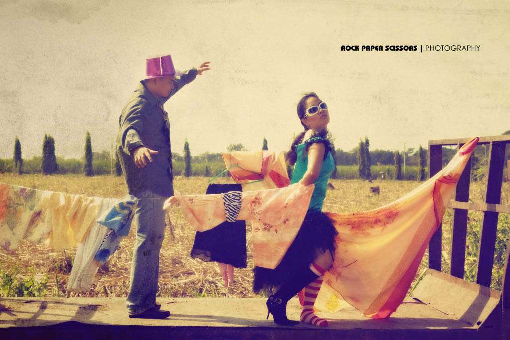 A sugarcane plantation in Northern Cebu was the perfect backdrop for our quirky theme of vagabond lovers. Hats, clown figurines, a colored umbrella, truck load of clothes, bicycles, and a purple teddy bear. Pure craziness in the middle of nowhere!