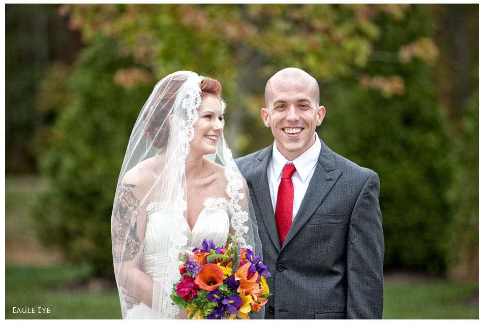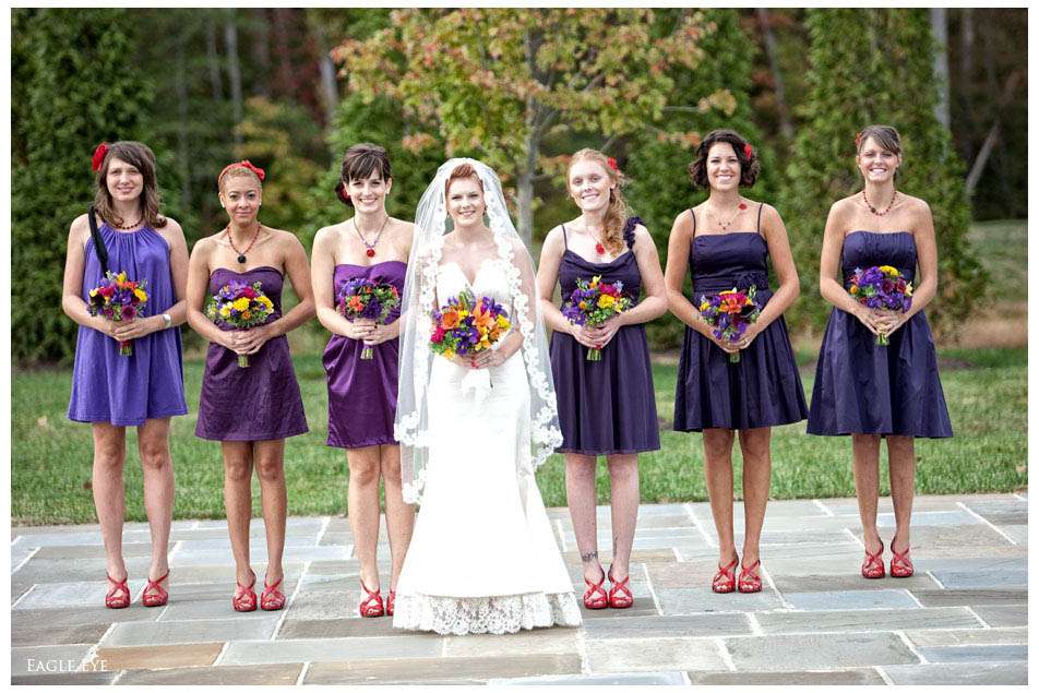 Ashley dress was by Alvina Valenta which she teamed it with an amazing antique brooch which she found at Ant Hill Antiques in Carytown in Richmond, Va. Their flowers were vibrant and sunny to match the theme and the bridesmaids all wore their own purple mis-matched dresses.