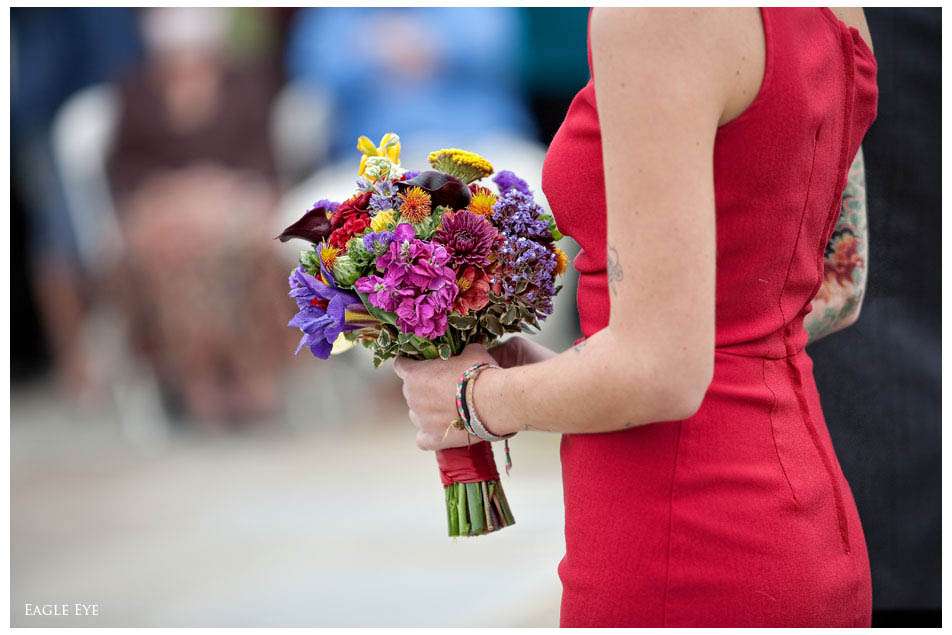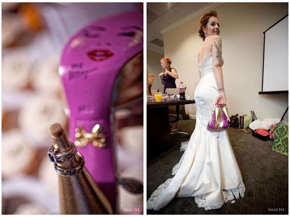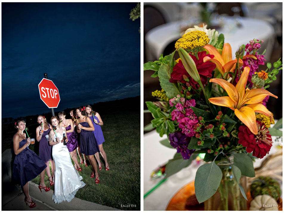 Ashley & Hunter’s wedding had me smitten as soon as I saw it. They went for a fun fair theme with brightly coloured and fun pinwheels, noise makers, rock candy, pumpkins and a BBQ from Buz n Neds Barbeque. This pair both have a self-confessed obsession with shoes so Ashley wore an amazing pair from Betsey Johnson with a Marilyn Monroe portrait on the sole and Hunter wore red, black and white high top Vans that matched their brightly colored wedding…the bridesmaids even wore red pumps to match.