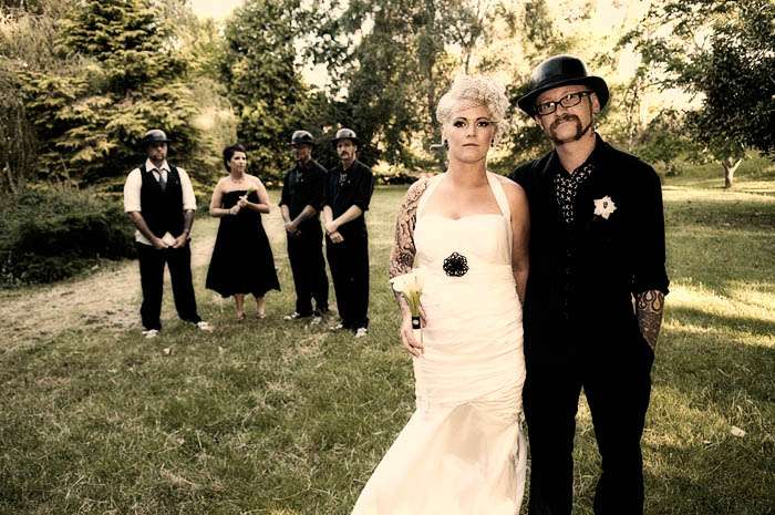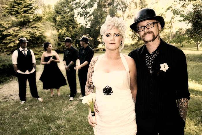 “Noel n’ Denise have a kooky fascination with skulls, and they turned up everywhere – before and during their big day. On the invitations, the guys ties, button holes, and on top of the cake.”