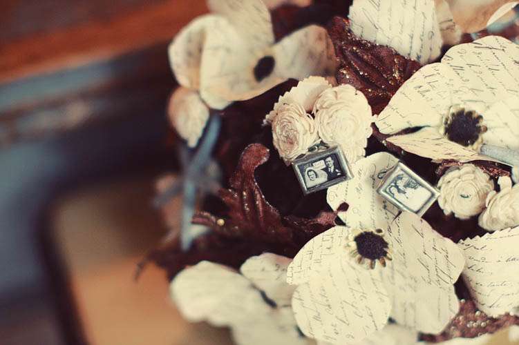 This beautiful Valentine’s day/love letter themed shoot was sent to me by Alice Hu and I’m afriad I couldn’t wait until February 14th to share it with you. The shoot was put together for Fantasy Floral Designs. Amanda Heer is the original creator of the vintage brooch bouquet and for this shoot she created another keepsake bouquet called “Love Letter”. The ‘flowers’ were made from vintage diaries and included photographs of loved ones to add another personal touch. The invitations in this shoot were provided by Papeterie Store.