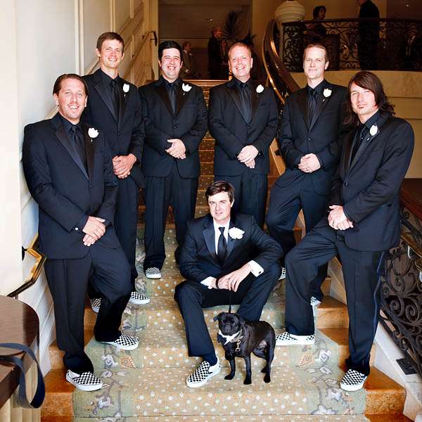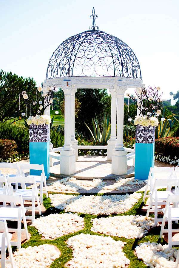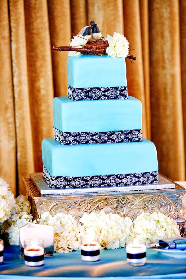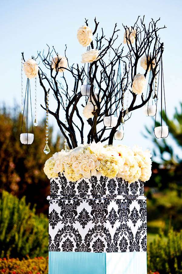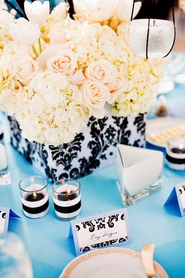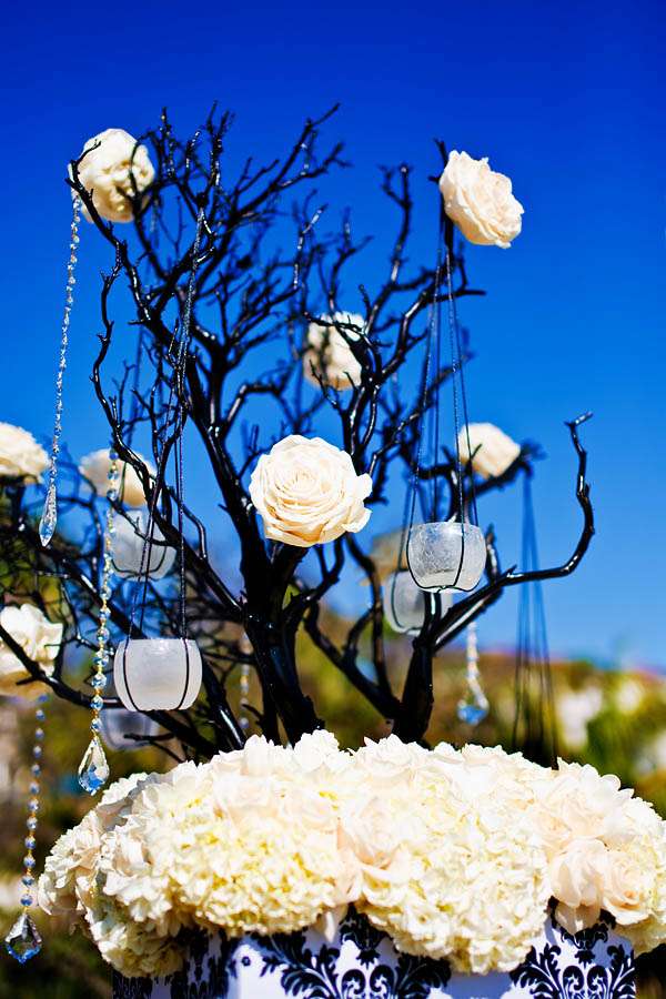 “My wedding planner, Kimberly Bradford introduced me to Square Root’s Alex Amidi who was with me all the way in designing the decor. I wanted dead black trees, he found me manzanitas and spray painted them black, I wanted icicles, he hung crystals from the trees, I wanted damask and blue, he nailed it. Whenever people ask me to describe my wedding I always say, Edward Scissorhands meets Martha Stewart and they dance to the sound of The Beatles at sunset in a blue damask winter wonderland.”