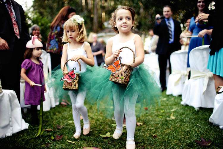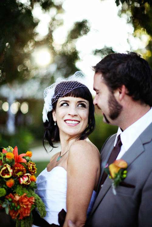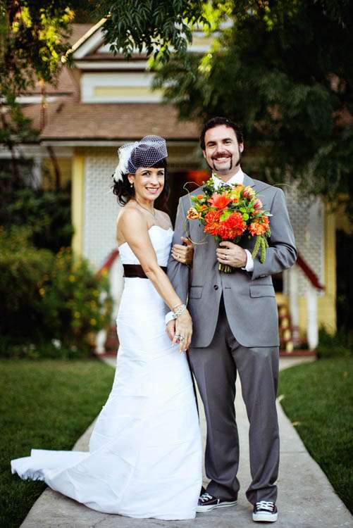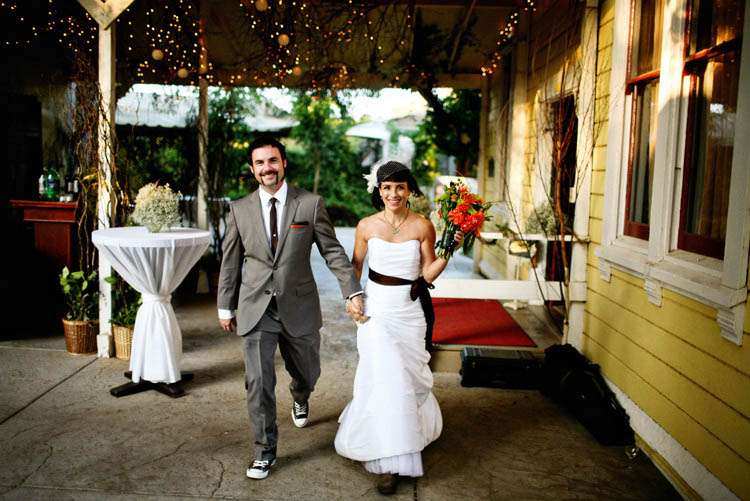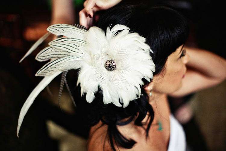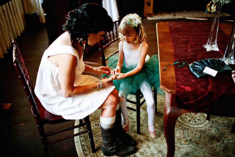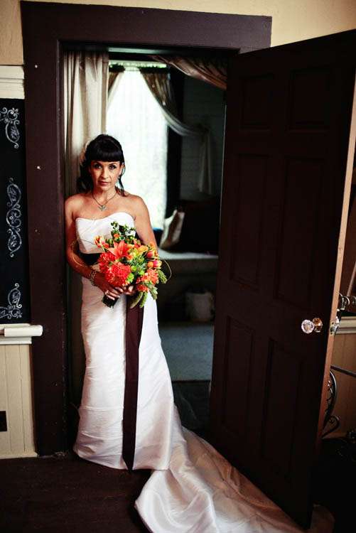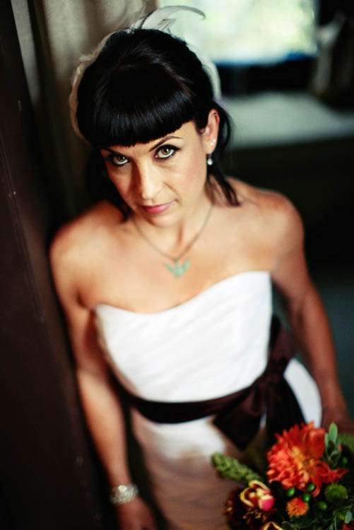 “I wanted to have a rock-n-roll wedding that felt like Dan and I had our hands all over” explained Dayna “I spent a lot of time pouring over wedding blogs and getting inspiration from cool brides. I picked themes that we both loved like reading, hence the book center pieces and framed quotes from our favorite authors, Fall and the month of October (the colors and flowers), simple down home (and cheap!) mason jars as vases. All of our music the entire day was hand picked and never ‘traditional’: wedding procession we had our friend play the ukulele, bridal march was Cat Powers “Sea of Love” (followed by The Honeydrippers “Sea of Love” for our first dance), our walk as husband and wife was Joey Ramone’s “Wonderful World”. Our flower girls wore homemade tutu’s, leotards and ballet slippers. We had a drawing after dinner with silly gifts of our life so far (a DVD of the first movie we saw, a pint glass from the restaurant where we met, a dvd of “It’s a Wonderful Life” cuz we’re nerds and watch it every year…). It was a rockin’ day for sure!”