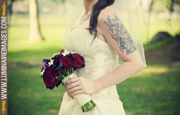 The couple got married in March Hacienda Restaurant in Santa Ana, CA. Jessica found her dress in the outlet section of Mon Amie bridal boutique in Costa Mesa, CA, but it didn’t have any labels on it so she was unsure of the desinger  – does anybody know?!  Her shoes were purple “Ivana” pumps by RSVP and her veil was made by Jessica’s mother Tammy.  Jessica’s maid of honor Lindsey and her mother (Lindsey Mac Designs) made her earrings and necklace.