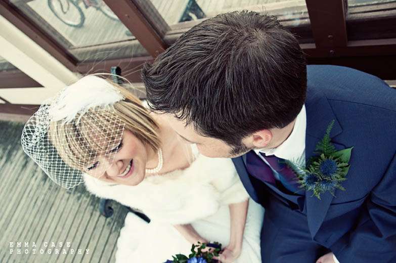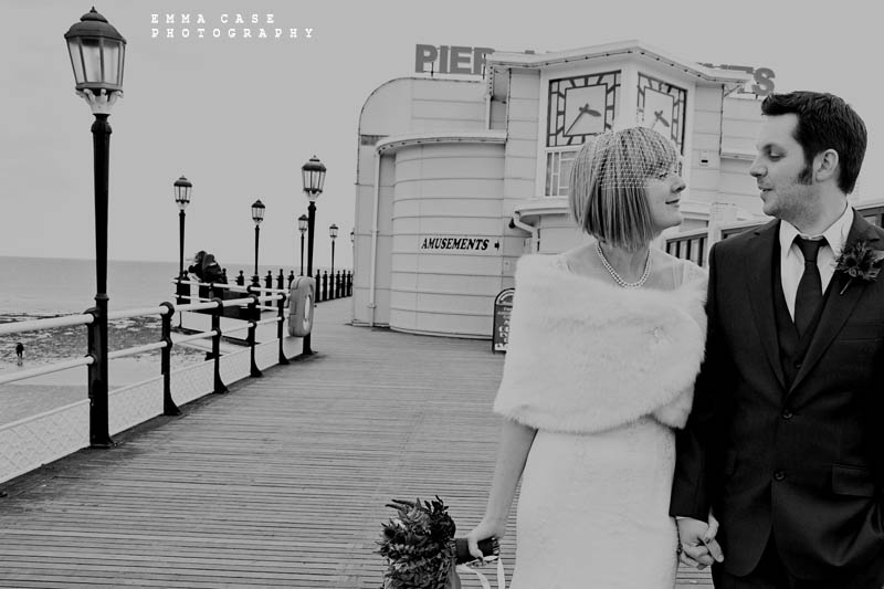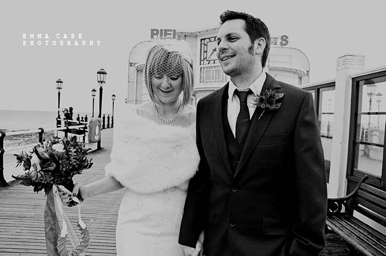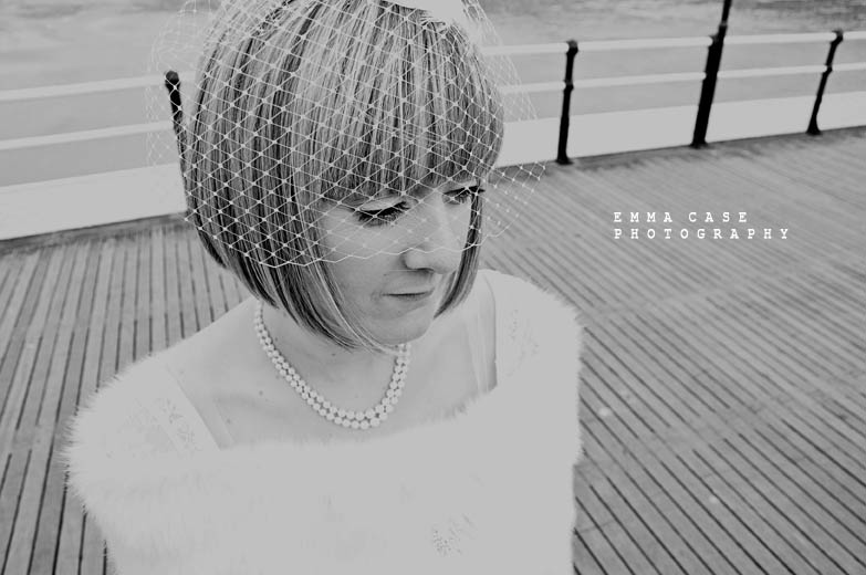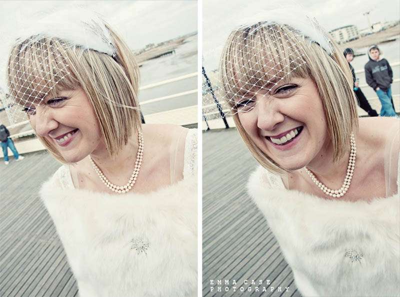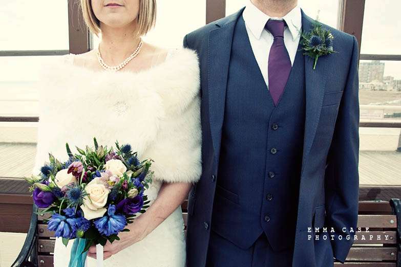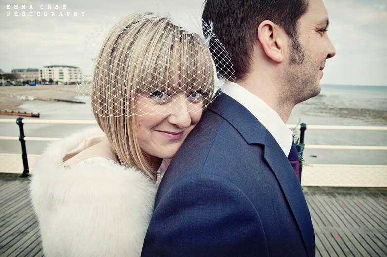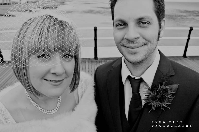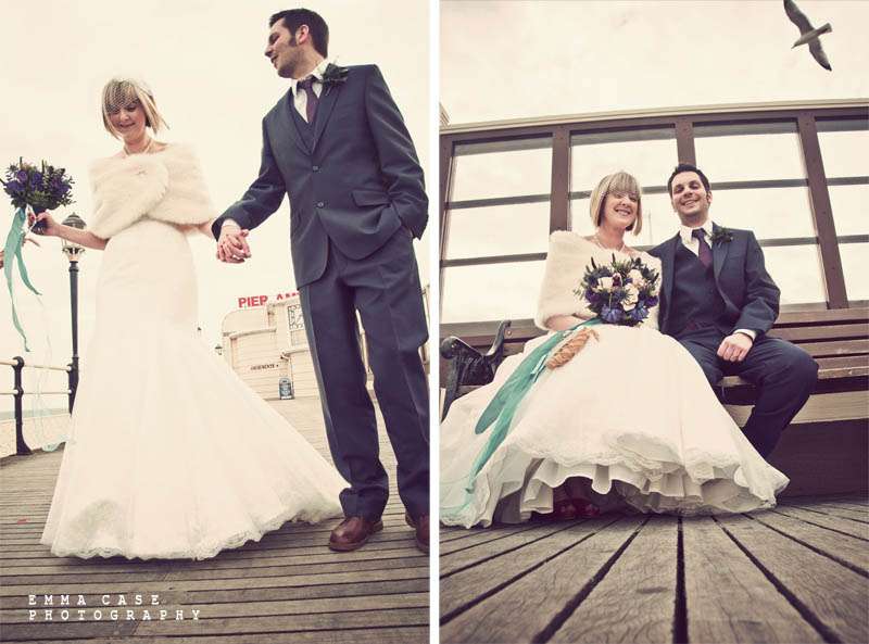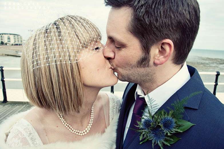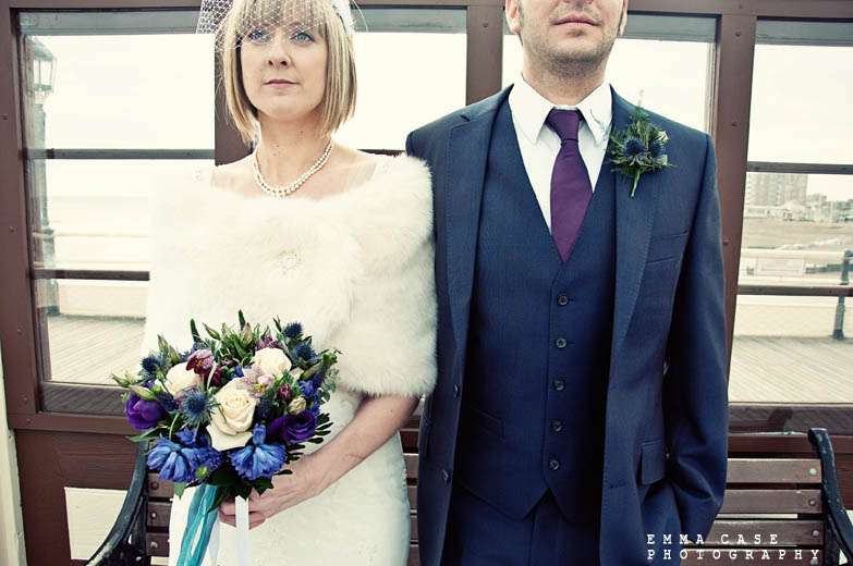 “Liz & Steve were married in Worthing at the Worthing Dome” photographer Emma told me, “which has the most amazing art deco cinema on the ground floor and a gorgeous sun room with a balcony on the first floor where they hold civil ceremonies and the reception. Opposite to this scrummy building was the beautiful beach and Worthing Pier…. errr… wow. Liz wore a jaw dropping fishtail dress with a cute faux fur shrug, a cute pearl necklace and a birdcage veil… ahh man this photographer was so in her element! Oh and her shoes! Bright red!… yummy, yummy, yum, yum. Steve also looked pretty dapper in a cool navy suit teamed with a purple tie and matching purple thistle boutonniere.”
