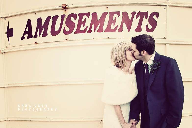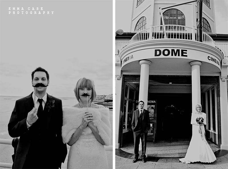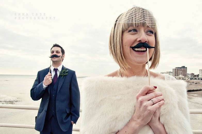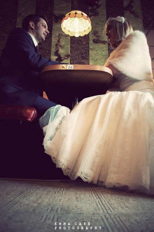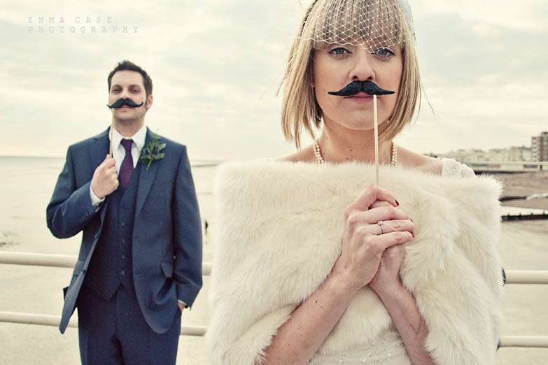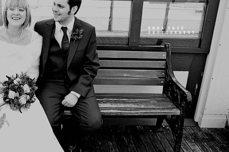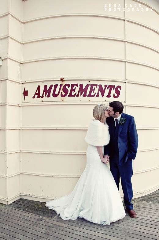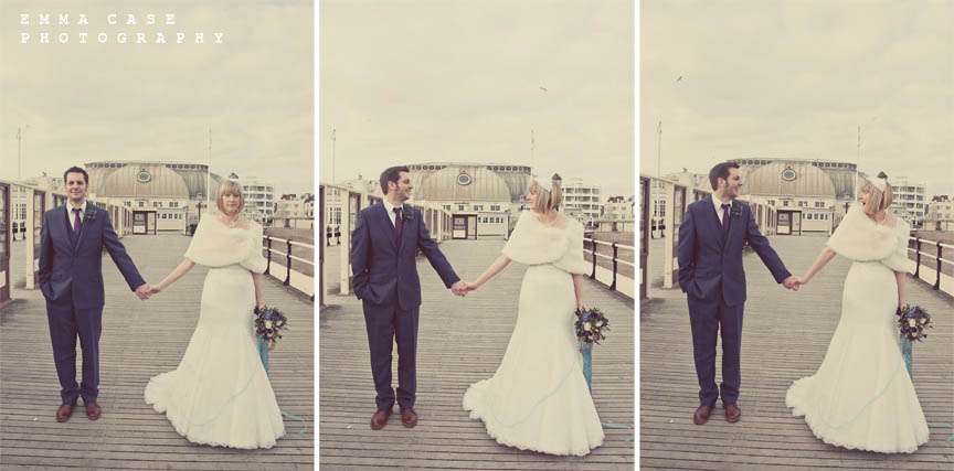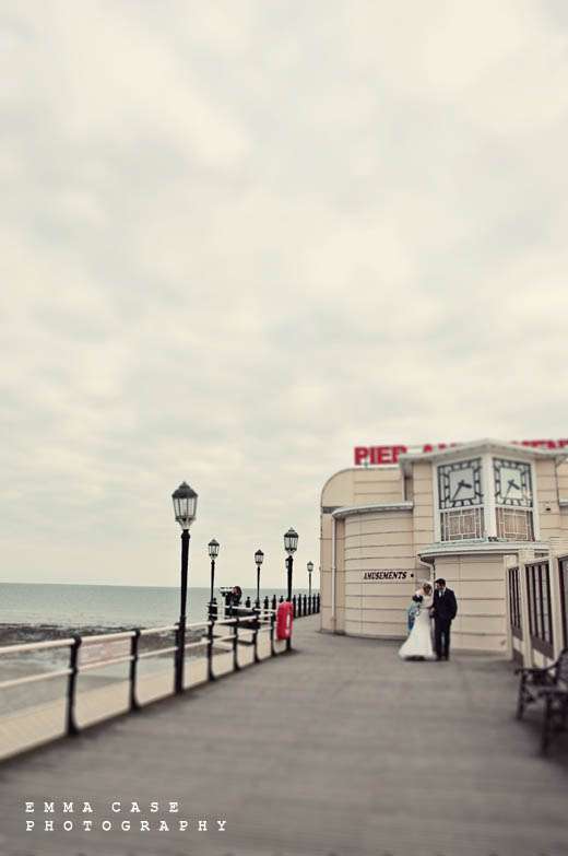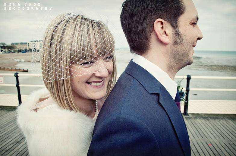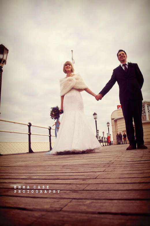 “Liz & Steve were married in Worthing at the Worthing Dome” photographer Emma told me, “which has the most amazing art deco cinema on the ground floor and a gorgeous sun room with a balcony on the first floor where they hold civil ceremonies and the reception. Opposite to this scrummy building was the beautiful beach and Worthing Pier…. errr… wow. Liz wore a jaw dropping fishtail dress with a cute faux fur shrug, a cute pearl necklace and a birdcage veil… ahh man this photographer was so in her element! Oh and her shoes! Bright red!… yummy, yummy, yum, yum. Steve also looked pretty dapper in a cool navy suit teamed with a purple tie and matching purple thistle boutonniere.”