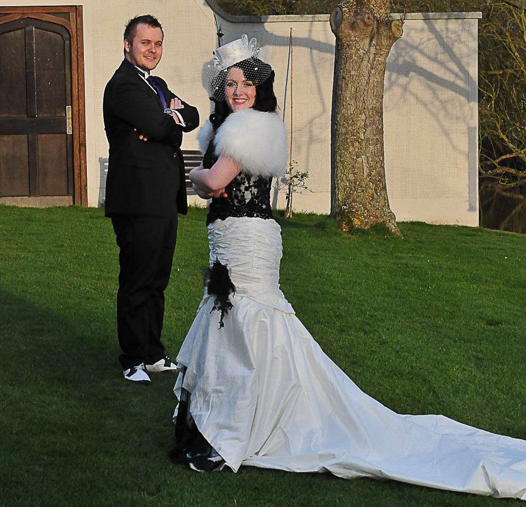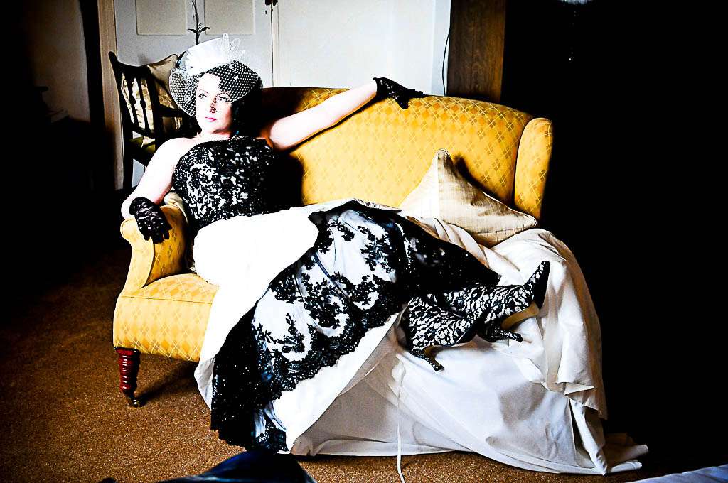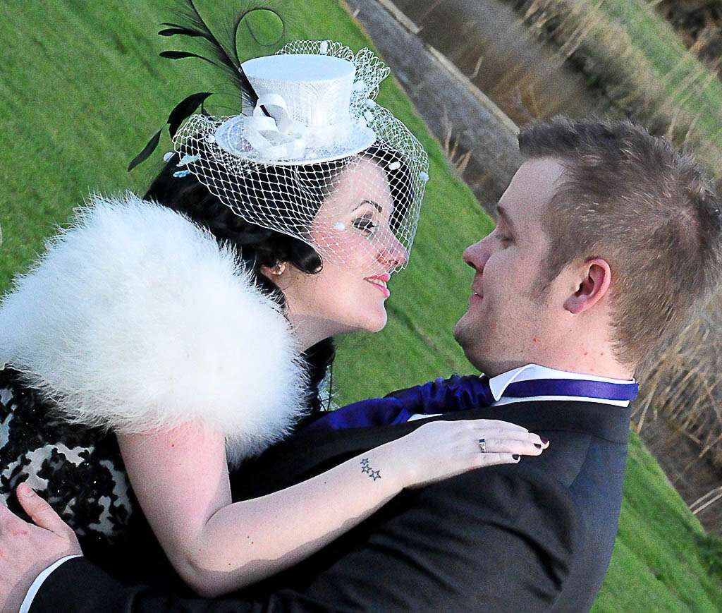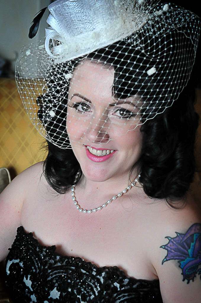 At first Toni thought she would have to conform to the princess dress/long veil/girly girl kind of wedding however she knew it really wasn’t for her “I’d snarl when I tried on dresses, and with my tattoos hanging out I just knew it wasn’t right.” Then she found her gorgeous black lace dress, Puerto Rico by Ian Stuart, in a magazine and she was smitten. “It looked like it had been made for me. I have always been a fan of pin-ups and took it from there with the over-all look. I never look girly and love the glamorous 40’s and 50’s so why not just base the whole thing on what me and my husband are about?! People looked at me like I was mental (which isn’t untrue) I wanted a real 40’s feel with a rock n roll edge. We are both metal/punk/rock lovers and thought we would try to incorporate those aspects into the day. We danced to Metallica, even the father/daughter dance was to Guns n Roses.”