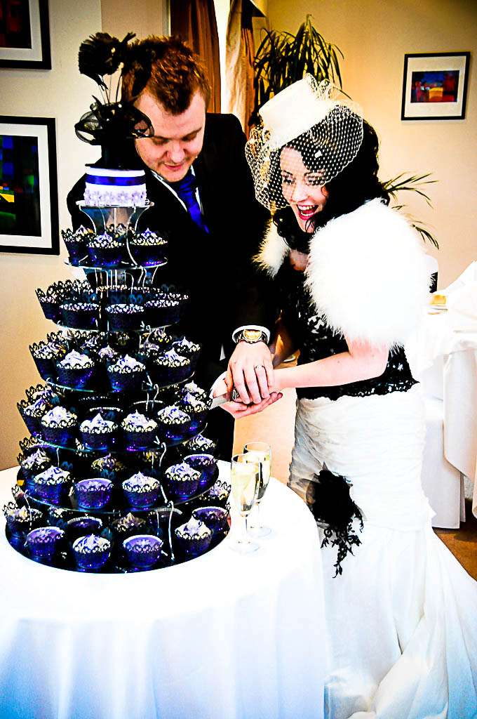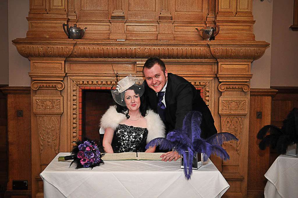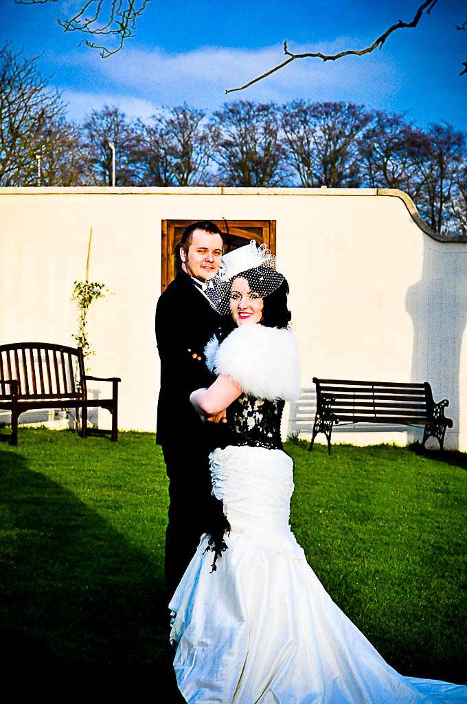 Toni & Richard had a gothic/burlesque inspired wedding at Prested Hall in Colchester in March of this year. “Our inspiration mainly comes from my admiration of burlesque and my unnerving love of Bettie Paige (who I have recently had tattooed on me)” Toni told me. “Not being much of a girly girl and never one who ‘dreamt of their big day’, I didn’t actually know where to start after the proposal. I like wearing jeans, having a Mohawk and being covered in tattoos and wearing too much make up!”