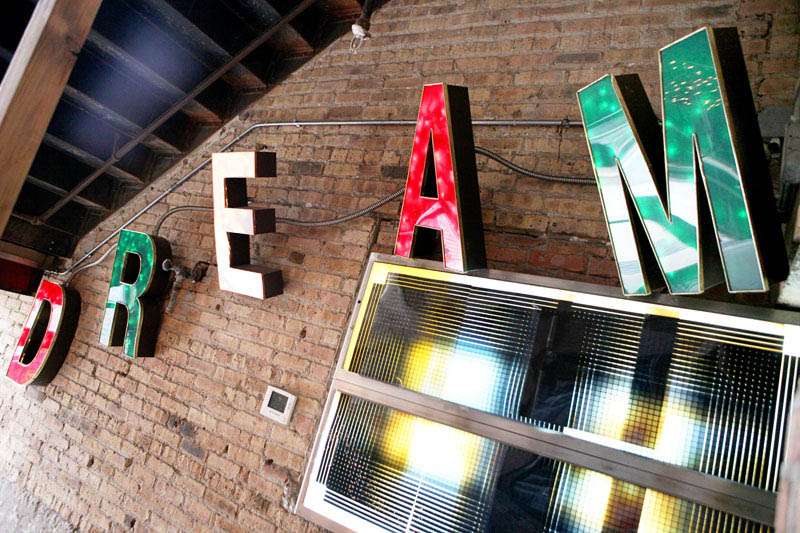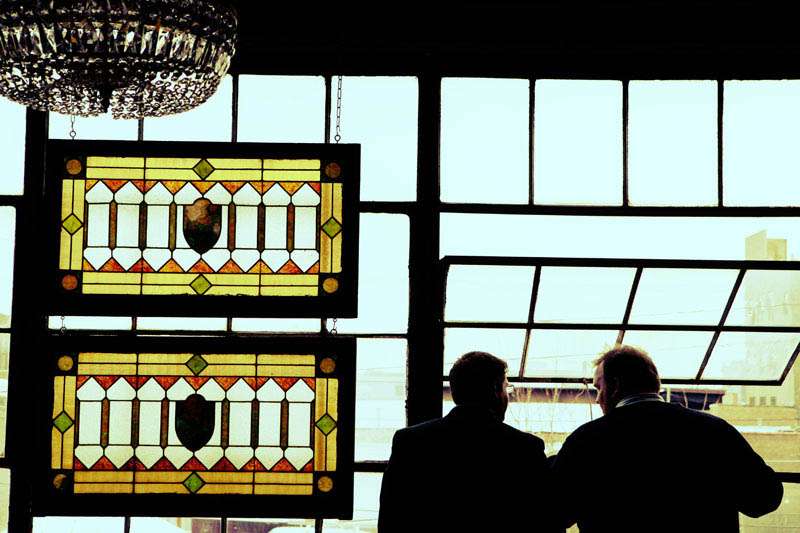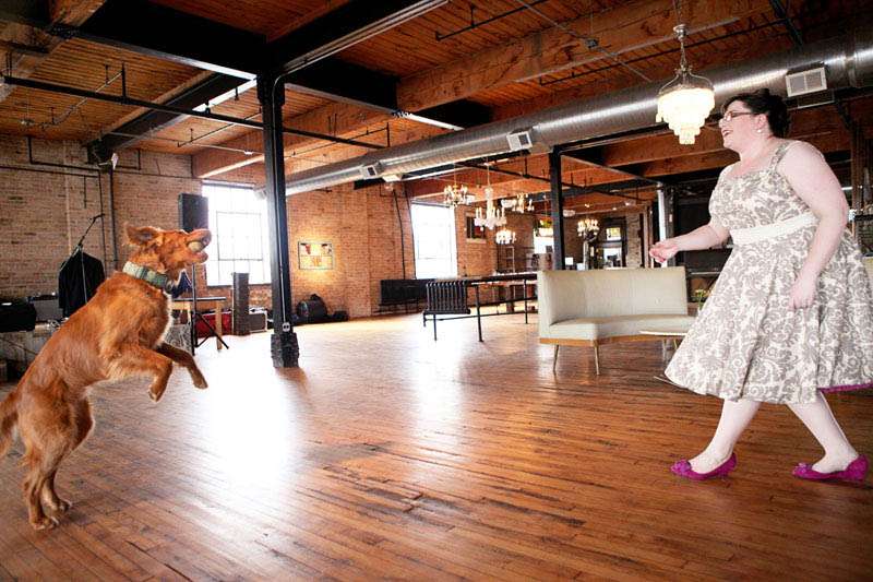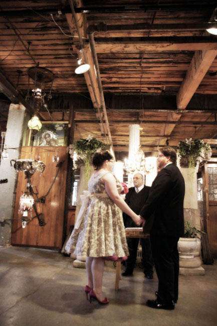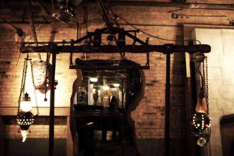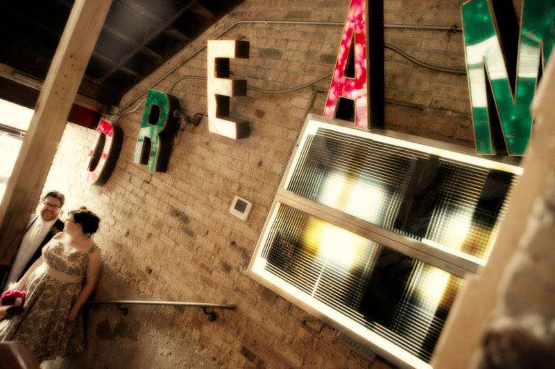 The wedding took place at the uber cool Salvage One, which, with it’s awesome signage and rustic, almost derelict, antique market interior provided the perfect backdrop to the event. Mary’s vintage look was provided by local Chicago design Jess Audey who custom made her beautiful dress and Antje Kastner at Tigerlilie who did her retro/rockabilly style hair and make up.