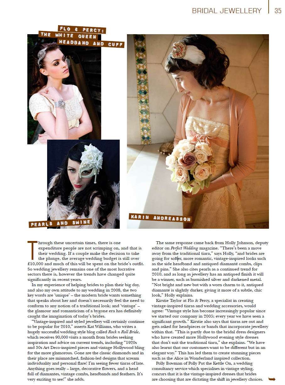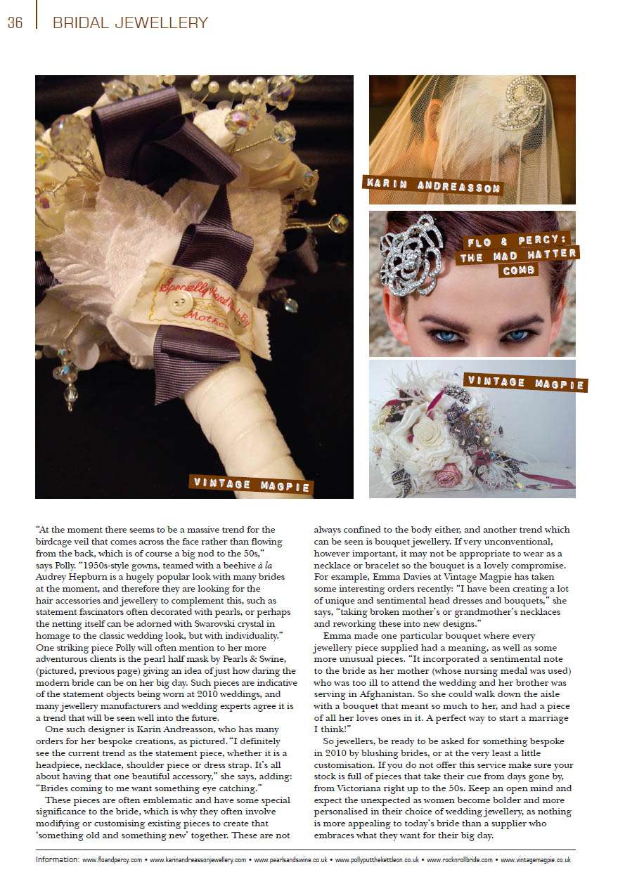 Do you remember Becky & John and their ‘Most Curious Party’ wedding that I featured back in January? Well, the lady is not now only a vintage wedding stylist, supplying vintage trinkets, teasets and details other brides and grooms to be (check out her company A Most Curious Party) but she is a brilliant writer. She was tasked with writing a piece on bridal jewellery trends for trade magazine ‘Jewellery Focus’ and she asked me to help her out. It was of course a pleasure and I’m more than happy after seeing that I’ve been put alongside gorgeous images of Flo & Percy, Pearls & Swine, Vintage Magpie and Karin Andreasson.