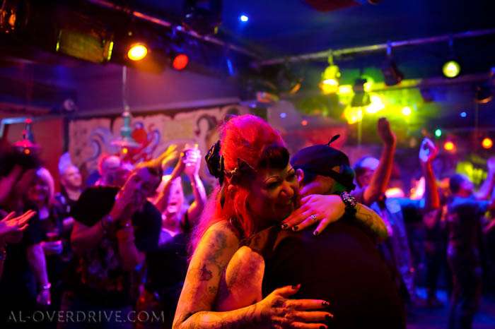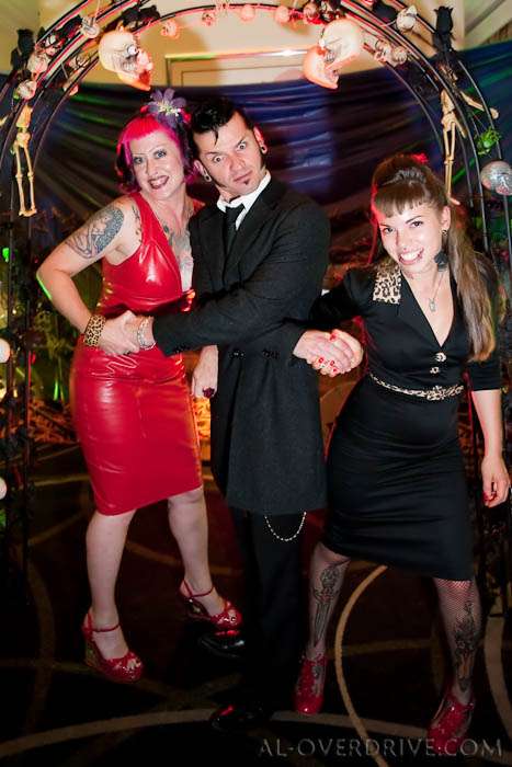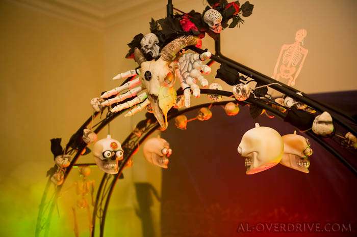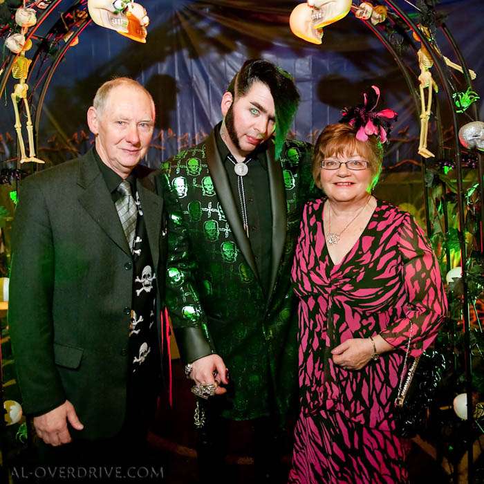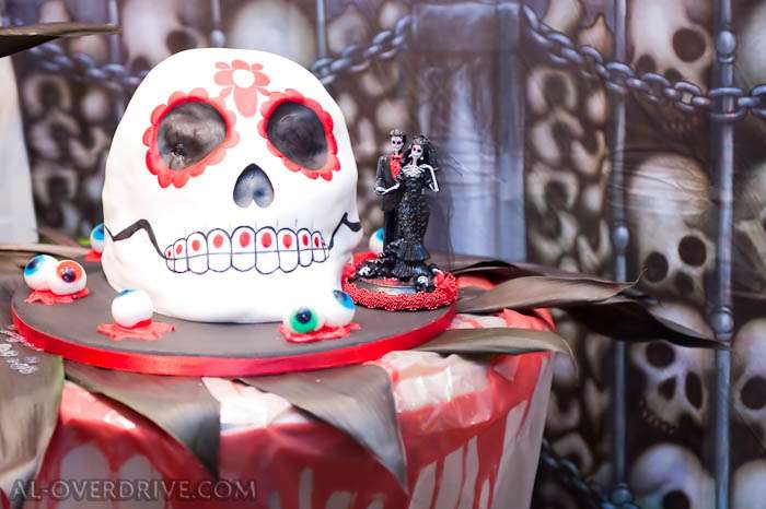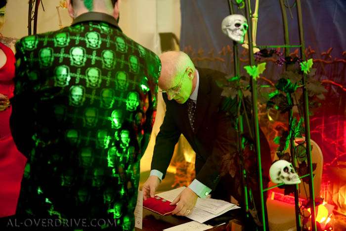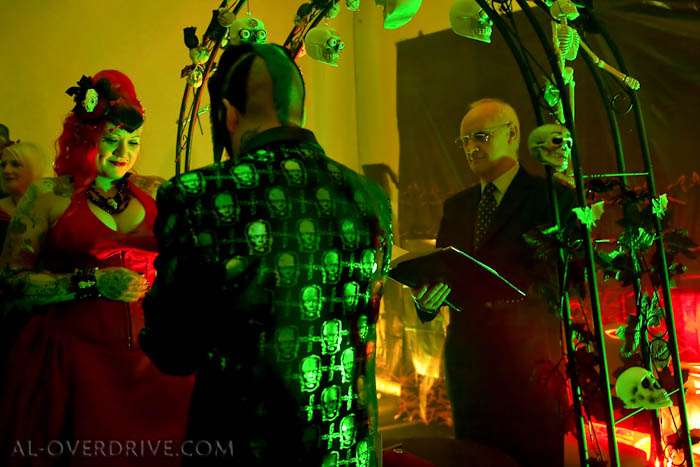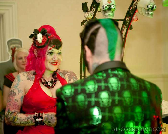 “This meant I had to light the formals in a slightly different way to ensure I got that punchy highly saturated contrasty feel that fits with the mood” photographer Al told me. “This was the first time I’ve seen a smoke machine used during the ceremony! The archway was decorated with skulls and light like a stage. As you can see form the photos the cake was a skull and all the attendees got to take home a set of cast-silver effect fangs to say ‘fangs for coming’ [groan]. Zombina and the Skeletones provided the live music for the reception, again fitting the horror-rockabilly theme.”