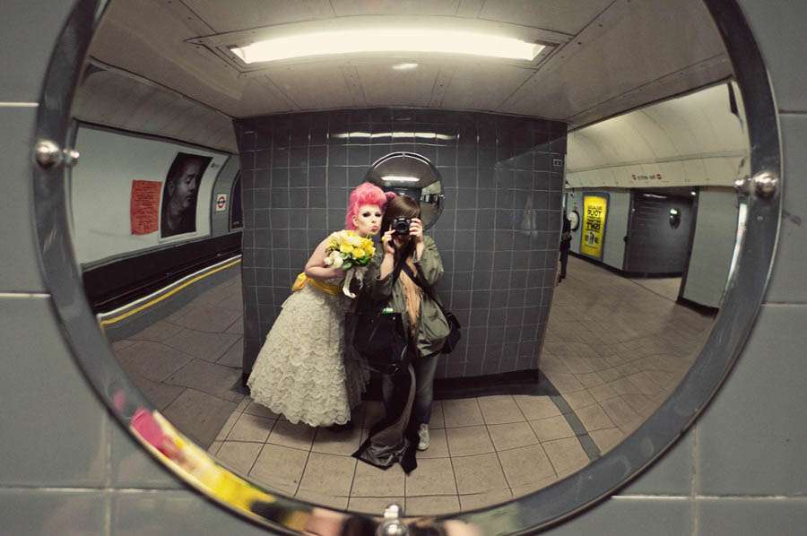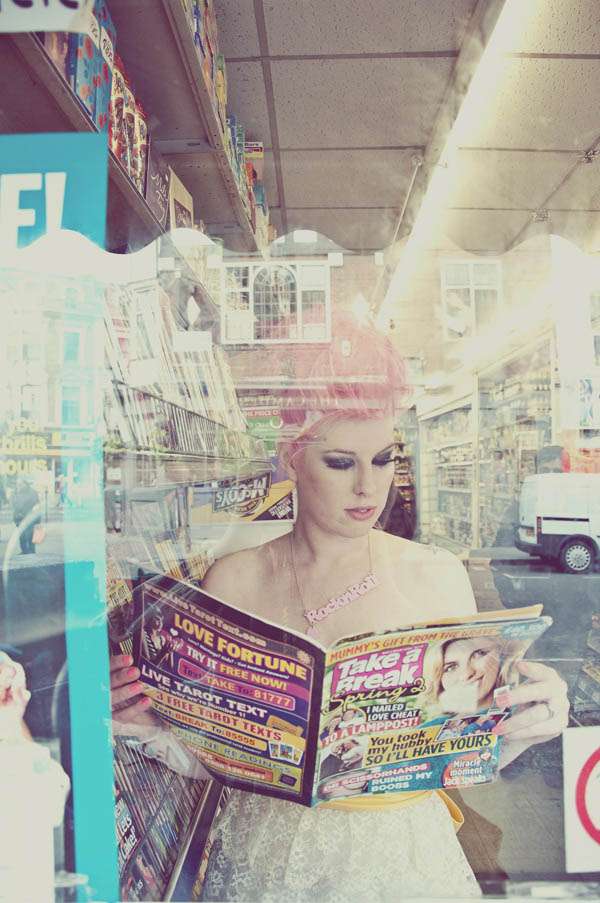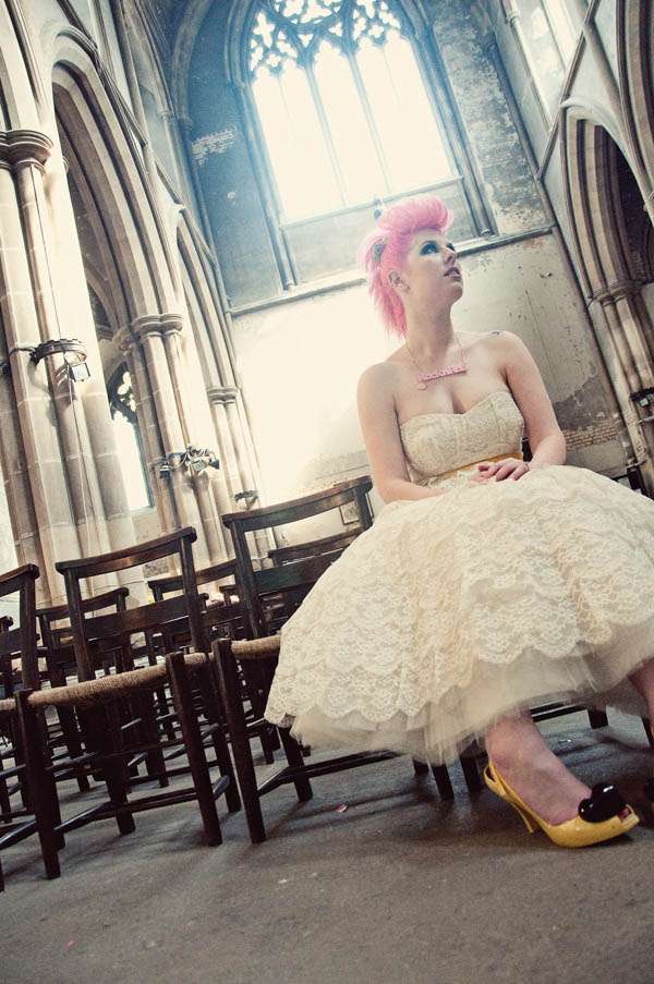 After being preened to within an inch of my life, Emma and I headed into the unknown. We decided to start off in Camden as if anything we wouldn’t feel so self-conscious being there as Camden is a notorious hang out for punks, rockers and everything in between. We ended up staying there all day. We found so many gorgeous and unusual locations and the people were all so lovely. Pretty much everyone we asked were happy to let us shoot in their shops (and even some sweet old ladies in a crumbling but oh-so-gorgeous Church were happy to oblige) that there was no need to move on. I got ‘papped’ many times by tourists and locals alike, probably wondering who this crazy chick dressed like a punk rock bride was!