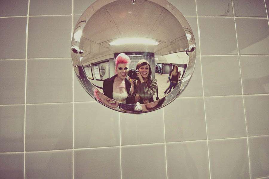 We had a few ideas of where we’d like to shoot, but as these things usually go we spotted so many places as we were just wondering around that pretty much any plans we had went out the window. My favourite locations were the bright yellow wall (goes great with the yellow bow etc!) the green grass (pink + green = love) the decrepit old house (including the hilarious school boys who shouted ‘oi , oi, let us be in a picture!’ from over the road) and the old church (which was literally falling down) and in the most incredible corset shop, like ever. We also shot in a record store, in the Stables market, in a retro clothes shop and on the Tube. Everyone was so nice and pretty much everyone we asked let us use their property for a mini photo sesh.