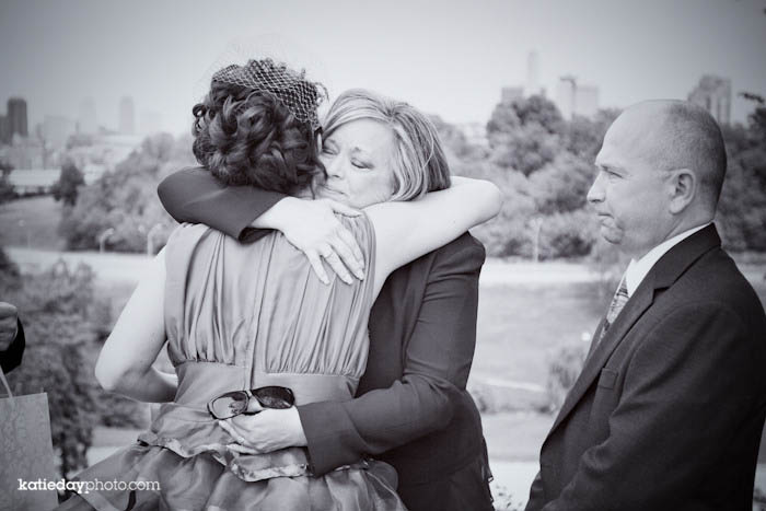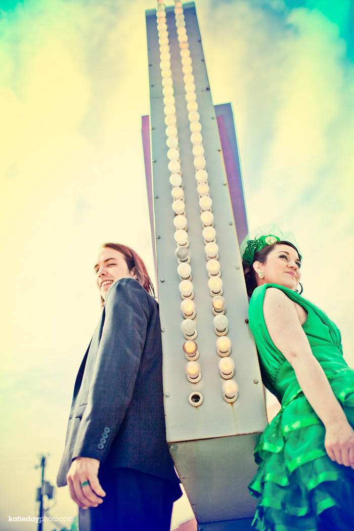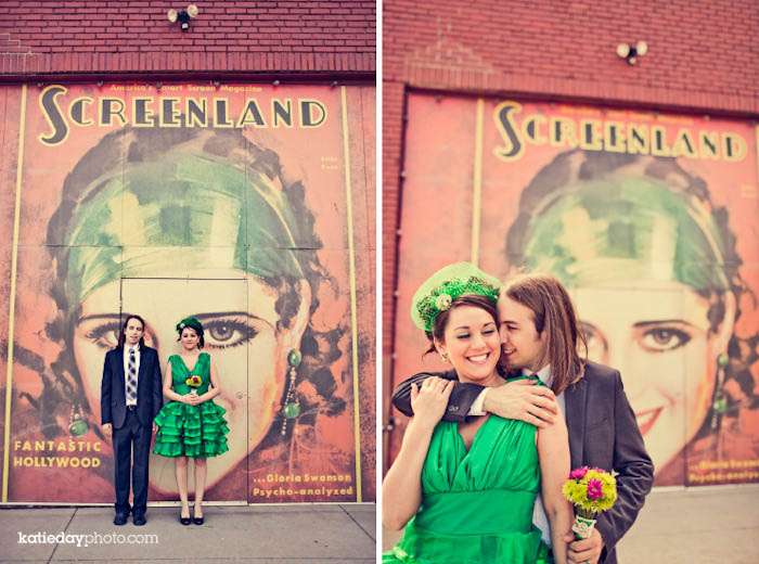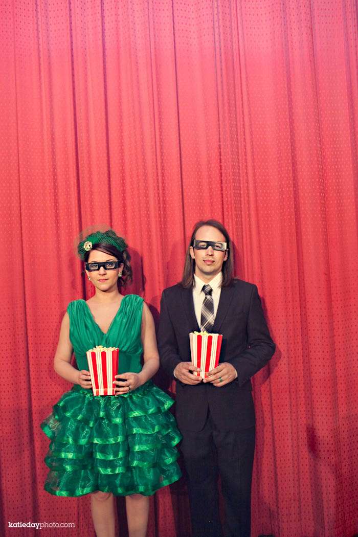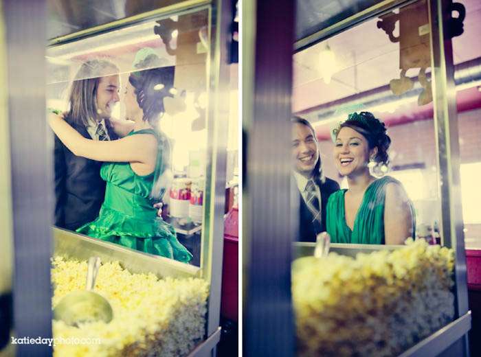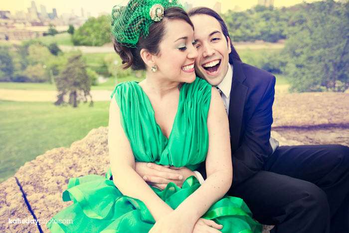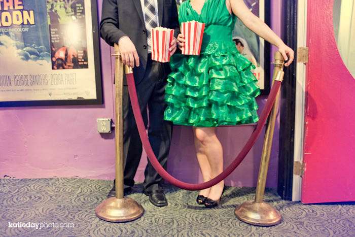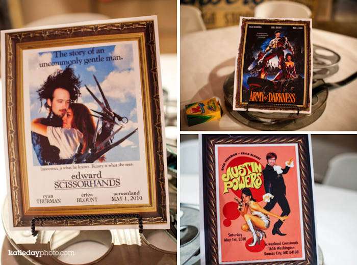 They chose the Scout Statue, Kansas City, MO for their ceremony as the couple drove past it every day and felt it was perfect for them. For their reception Screenland Crossroads, Kansas City, MO provided the perfect mix they were looking for – reasonably priced and unique. “We had seen a couple movies at the theatre and instantly fell in love with the place- who wouldn’t love fully reclining leather movie theatre seats? It also went along with our Kansas City theme, as it is part of a small local chain of theatres. We met with the event coordinator, Bryan Williams, and he was more than willing to help us achieve anything we wanted to with our party. We loved all the vintage movie posters that cover the walls, and the leopard print carpet. Added bonus: cheap drinks since we planned on having a cash bar” Erica told me.