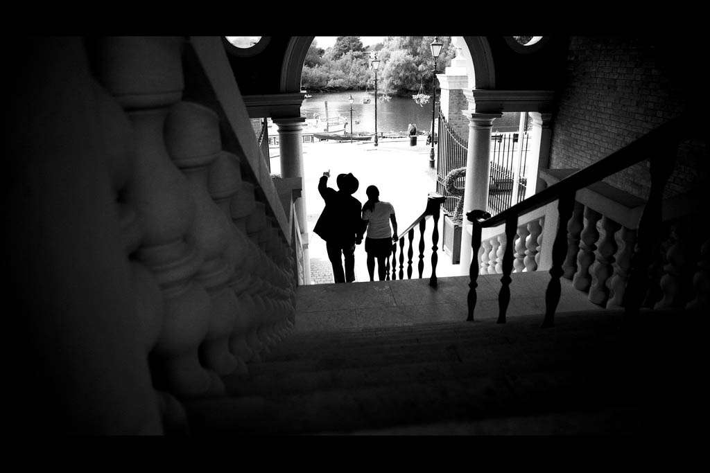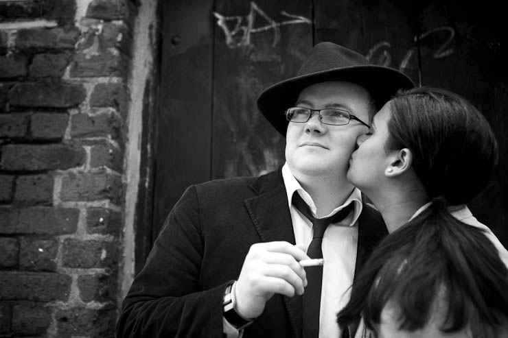 Shalma & Leo wanted to go for a film noir, classic film and super stylised shoot and in an unusual departure from his usual hyper colourful style, David decided process this entire shoot into black & white to fit in perfectly with this theme. “This couple are into their photography big time” David said “but they’re also in their classic films and wanted to have a pre-wedding shoot that referenced one of their favourites, A Bout De Souffle. This was a french film where the characters mostly smoke and drink coffee a lot – so we tried to recreate the streets of Paris in Richmond!” Go check out the stills from this film – Shalma & Leo got their outfits styled down to a ‘t’!