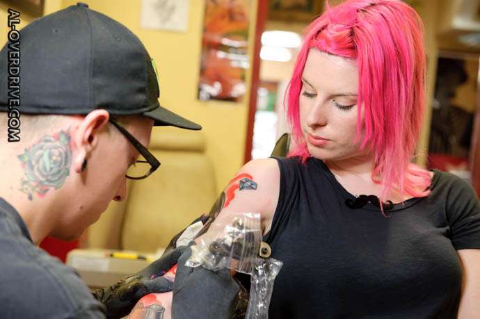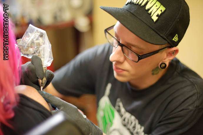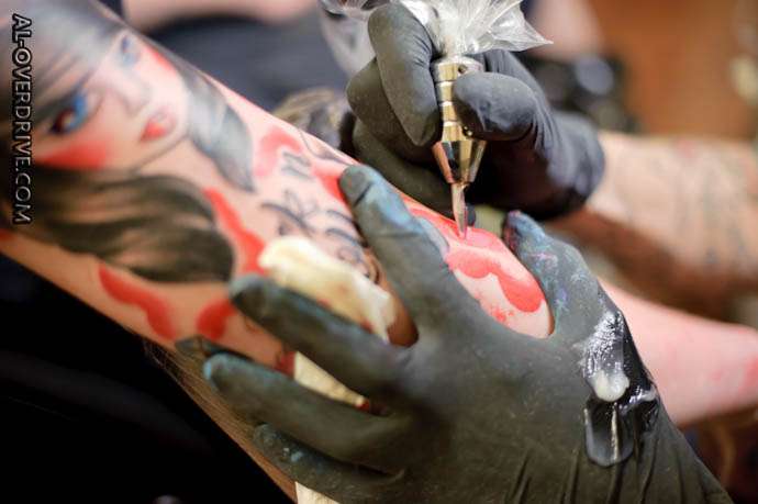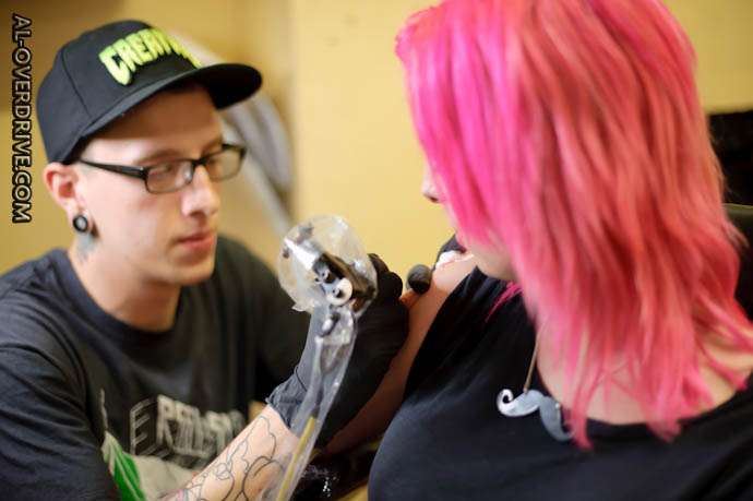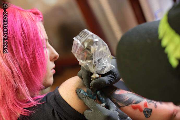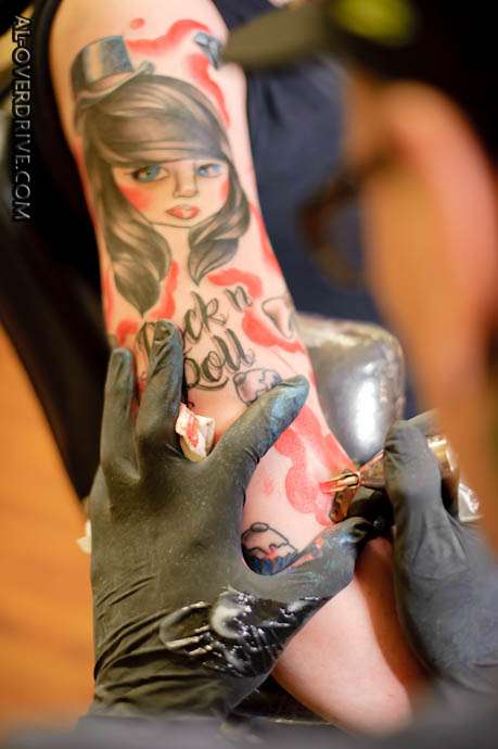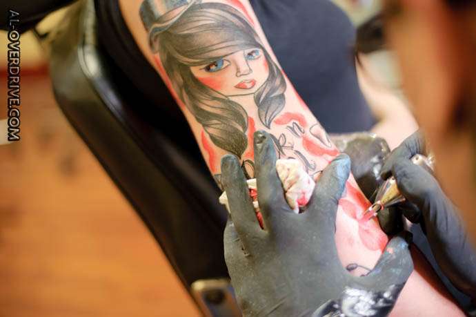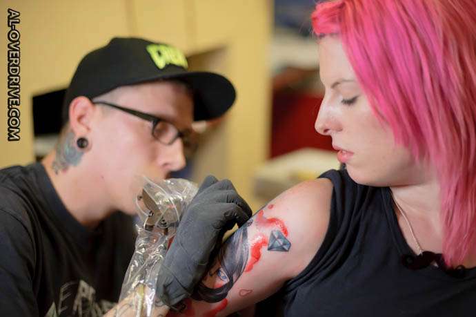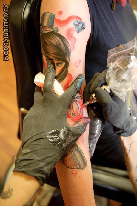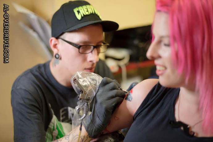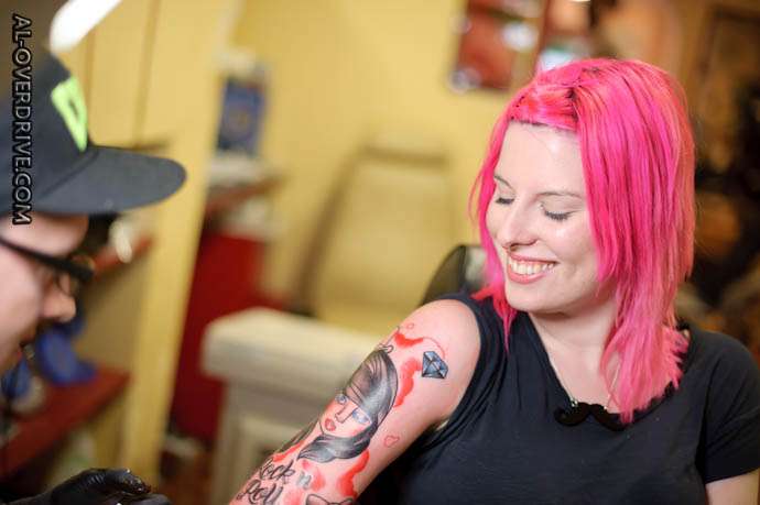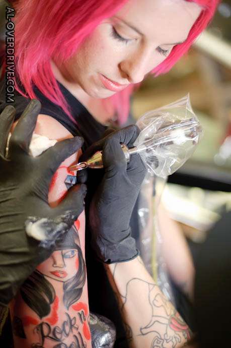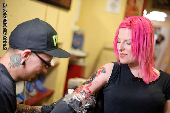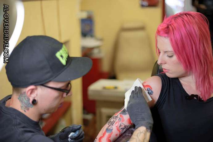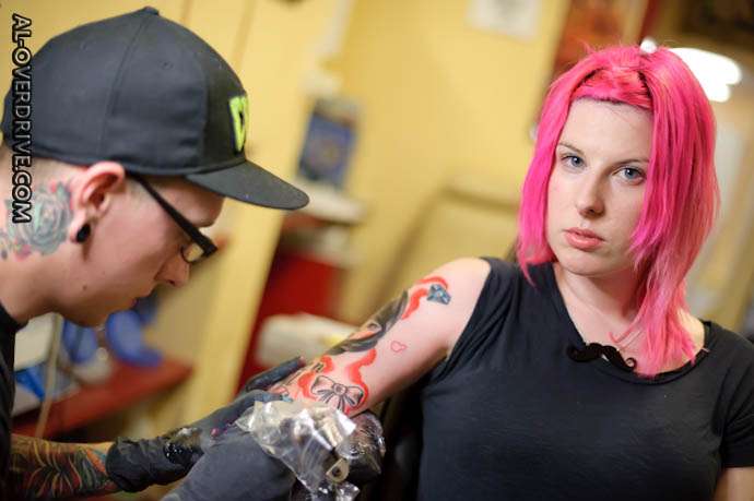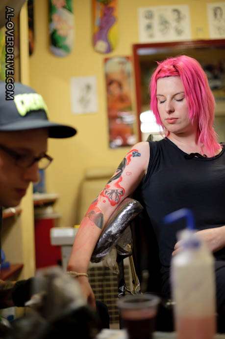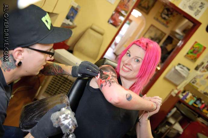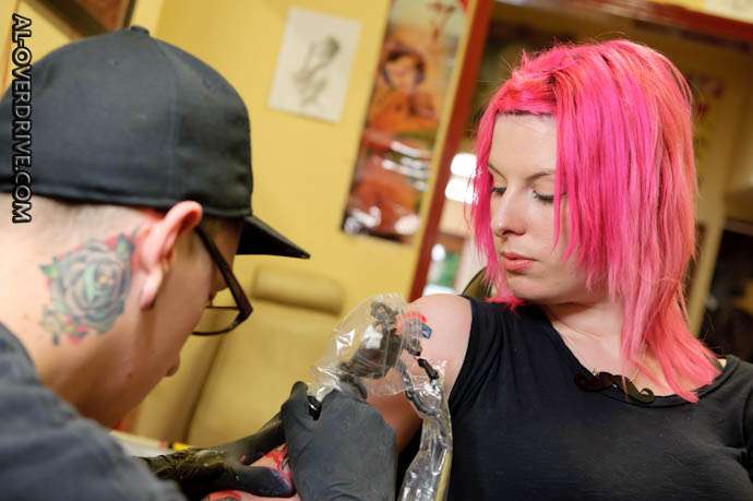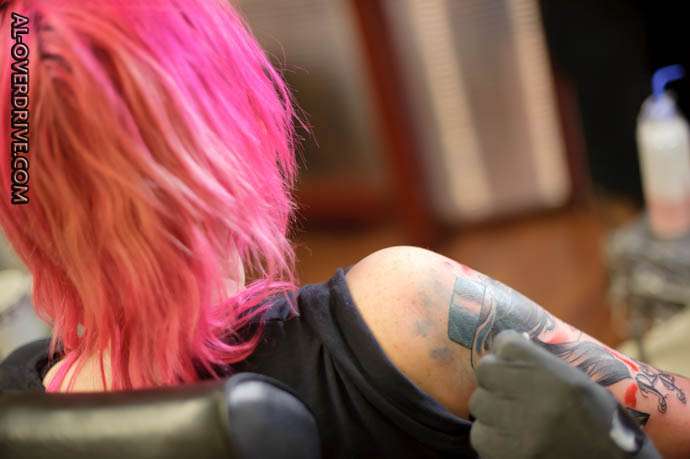 At my last session at the amazing Blood Brothers Tattoo Studios in Holloway Rd, London, photographer Al Overdrive offered to pop down and take a few photographs of me in pain/being brave/getting inked. Al won Tattoo Photographer of the Year this year and is pretty well known in the music and tattoo photography market, shooting for magazine like Skin Deep, Tattoo Master, Rock Sound and Terrorizer as well as shooting some pretty damn cool alternative weddings.