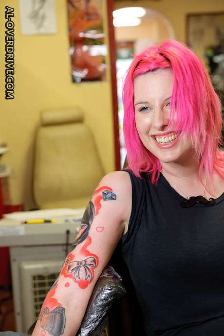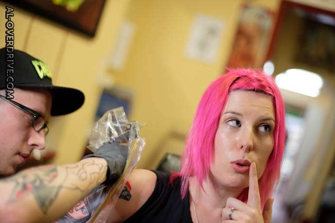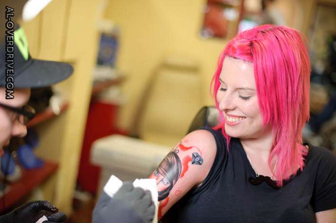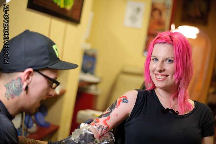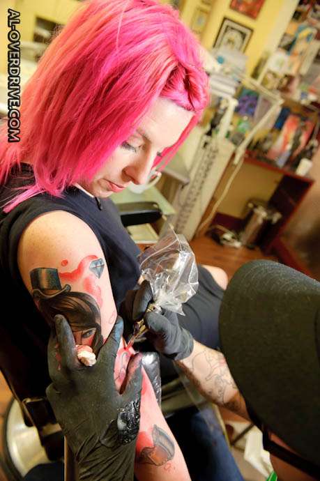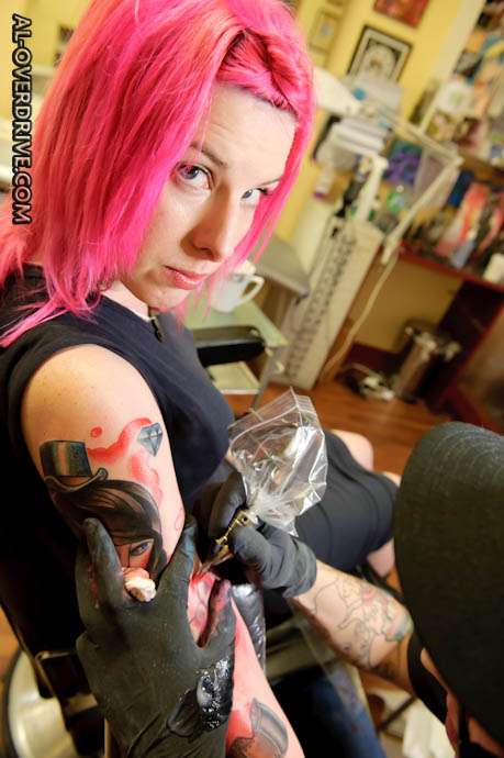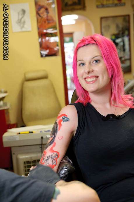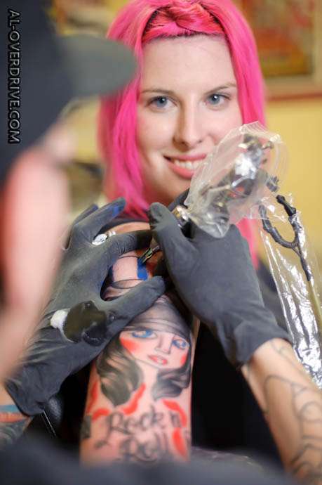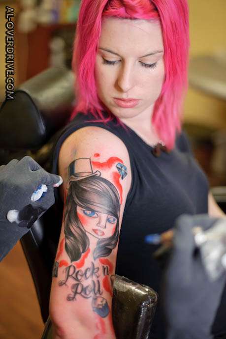 So while tattooist Mike Harris (I love him) went to work on me (so to speak!) Al snapped away. Aren’t these shots great? I’d do have to say it wasn’t the most fun photo shoot I’ve ever done (ouchy) but the results are a great little memento to have. My facial expressions are priceless. I seem to go from pained smile to manic grin to an “I’ve had enough now thank you” look rather quickly!