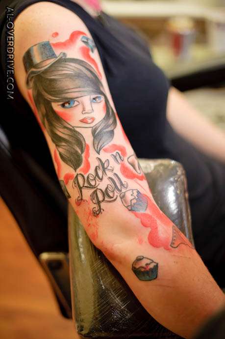 OK, so I’m so bloomin’ impatient. My sleeve tattoo technically isn’t finished yet (I’ve got another 4 hours or so to go in 4 weeks time – I’m adding some more colour to the background and some more cupcakes and diamonds – yum) but I’ve waited 2 weeks already to share these pictures and I can’t do it anymore!