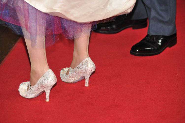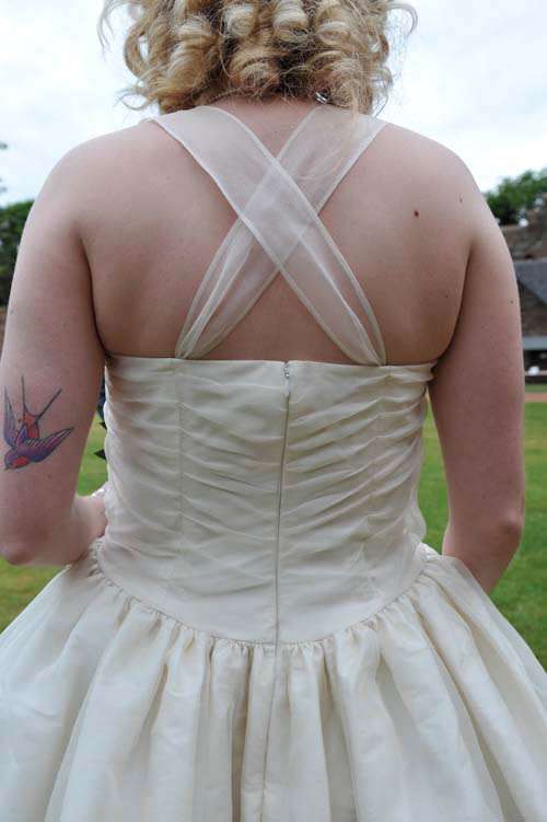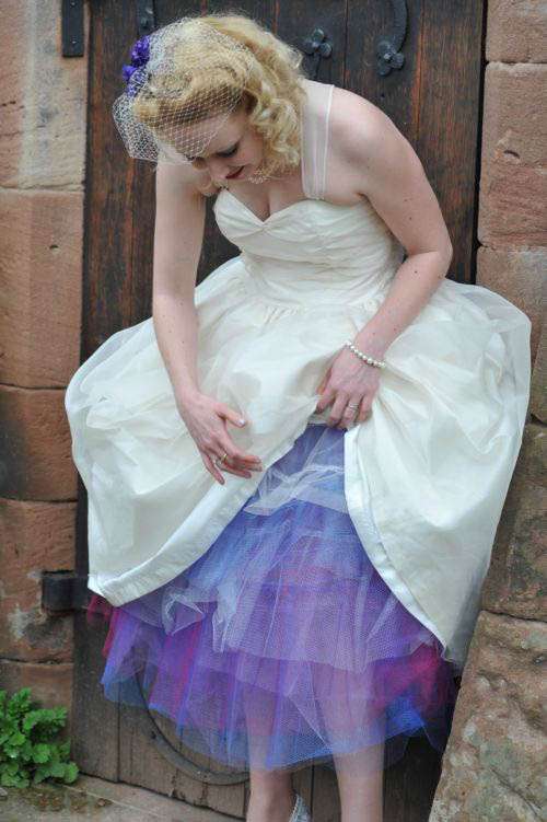 As soon as a saw Catherine & Kev’s fabulous 50’s style wedding, my attention was drawn to one thing – that amazing Stephanie James Couture dress! I have been a superfan of the designer ever since I found and fell in love with this amazing multi-coloured tulle creation and OMG Catherine’s had a similar underskirt. She too fell in love with this dress when I featured in a while ago. “My maid of honour, Kirree, found a dress on Rock n Roll Bride made by Stephanie James Couture” Catherine explained. “It was the ‘Lustful’ or ‘Tame Fifi’ dress you featured a while back, as soon as she sent me a link to the pictures I knew that was the dress I needed to get married in! I quickly got in touch with Stephanie and asked if she could make me a similar version and she said yes!”