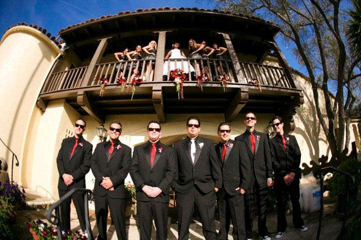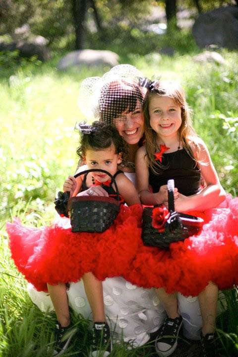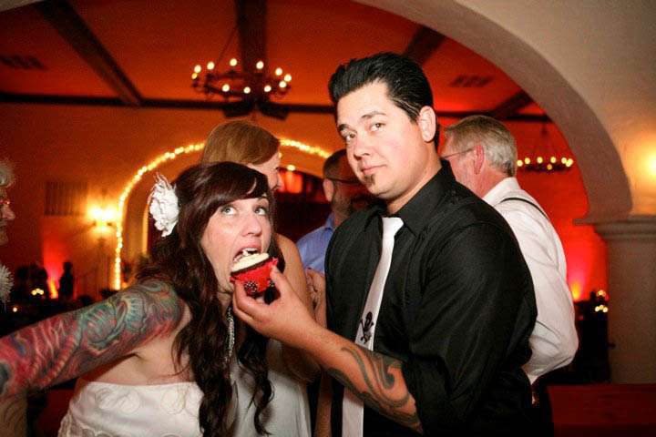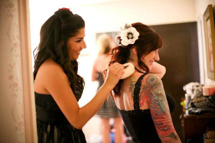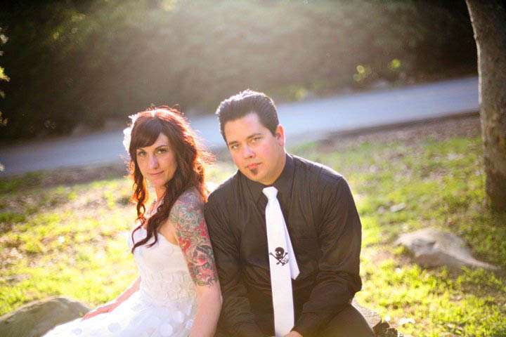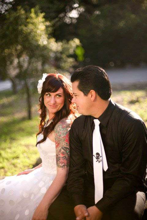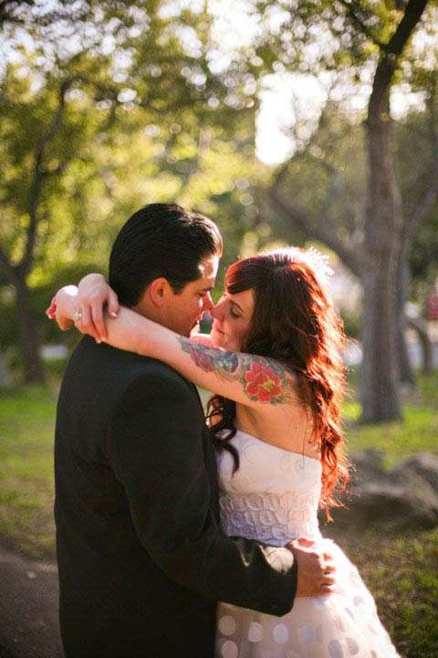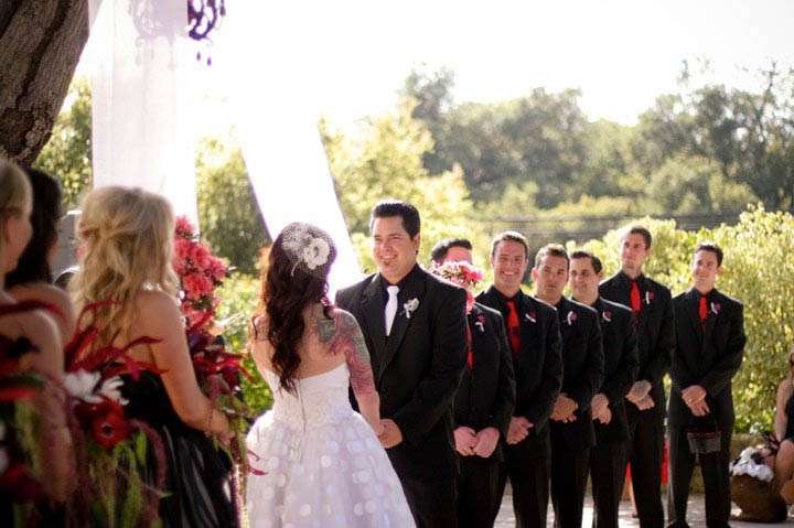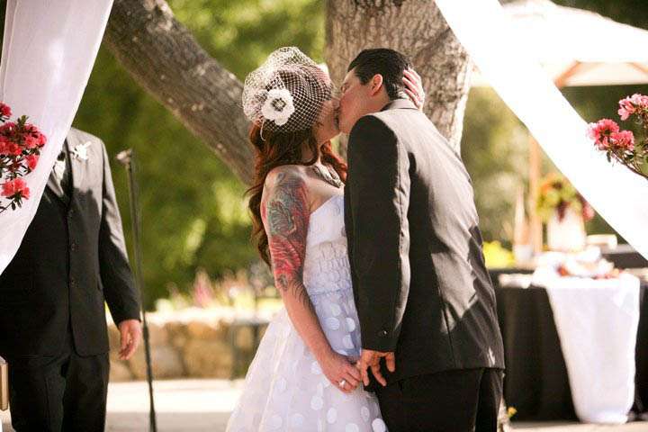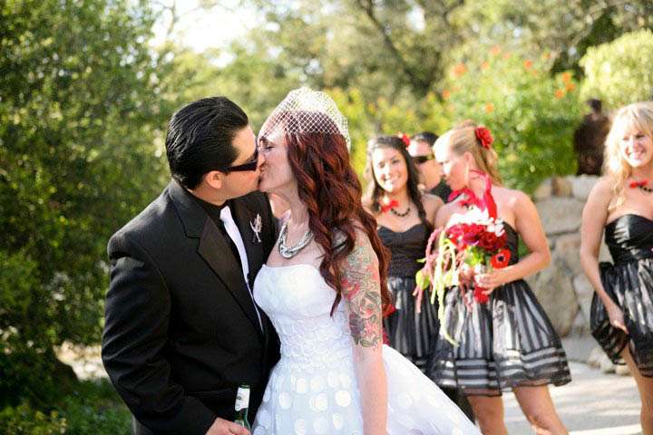 I’ve got yet another bit of retro rockabilly lovin’ for you today, in the form of Nick & Jamie’s Santa Barbara wedding. The ceremony and reception took place at The Rockwood Womens Club which proved to be the perfect backdrop to their day. Jamie looked stunning in her Maya dress by Michelle Roth, but it had a bit of a story behind it! “”Ohhhhh the dress….it was almost a nightmare! It was a Michelle Roth “Maya” that I bought used on Oncewed. I took it to a local alterations lady who cut it too short and messed up the top! Luckily I have a dear friend in the fashion industry, Denice Dir who saved the day by not only adding the black tulle underneath, sewing in a petticoat and took 45 minutes to carefully seam rip the top and fix what the other lady had messed up. She even made my dog’s collar piece out of my dress trimmings and surprised me on the day of my wedding with the special stitching she did inside!”