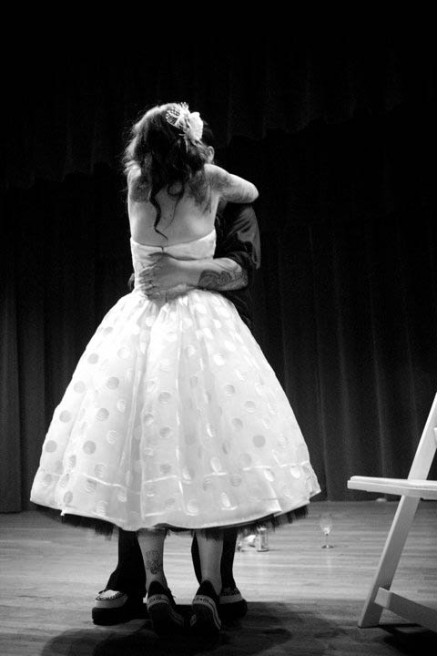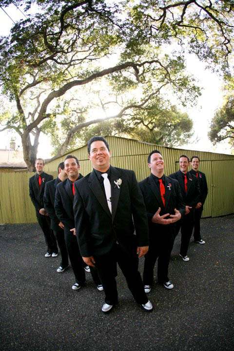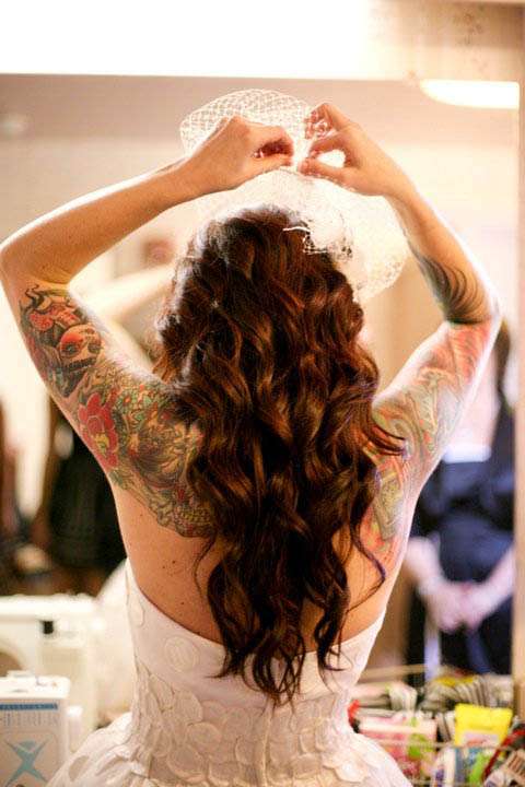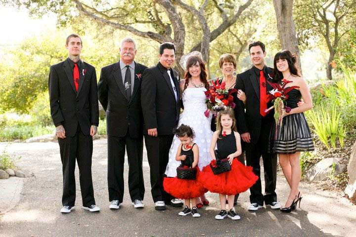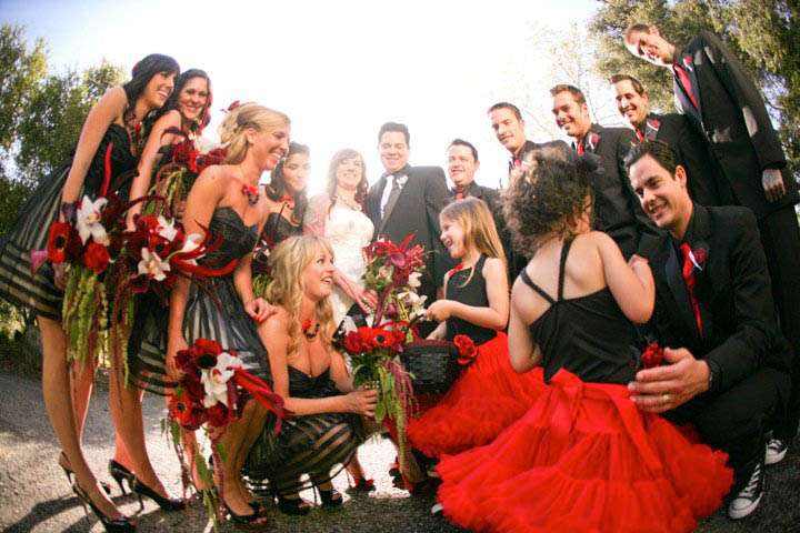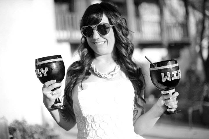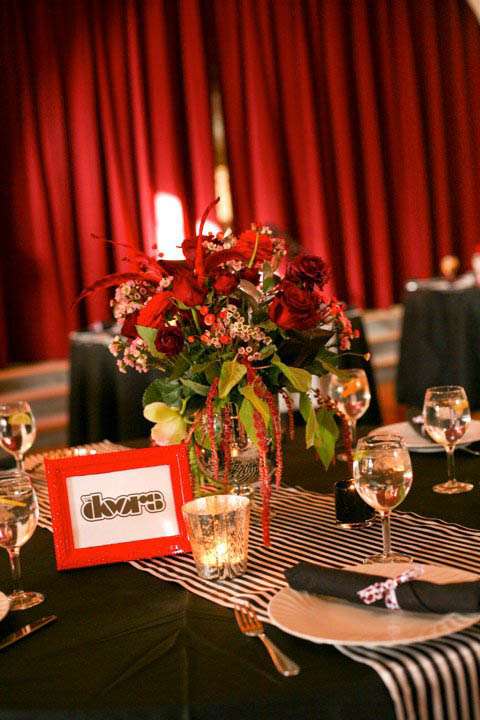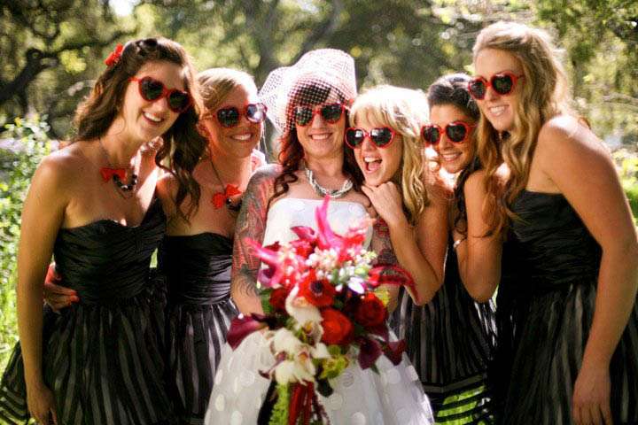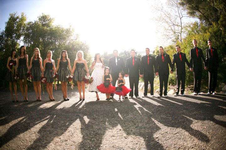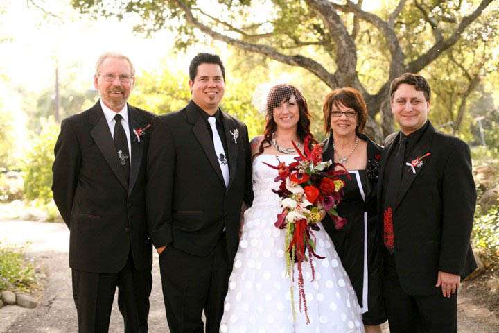 I’ve got yet another bit of retro rockabilly lovin’ for you today, in the form of Nick & Jamie’s Santa Barbara wedding. The ceremony and reception took place at The Rockwood Womens Club which proved to be the perfect backdrop to their day. Jamie looked stunning in her Maya dress by Michelle Roth, but it had a bit of a story behind it! “”Ohhhhh the dress….it was almost a nightmare! It was a Michelle Roth “Maya” that I bought used on Oncewed. I took it to a local alterations lady who cut it too short and messed up the top! Luckily I have a dear friend in the fashion industry, Denice Dir who saved the day by not only adding the black tulle underneath, sewing in a petticoat and took 45 minutes to carefully seam rip the top and fix what the other lady had messed up. She even made my dog’s collar piece out of my dress trimmings and surprised me on the day of my wedding with the special stitching she did inside!”