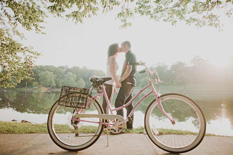 Simple, sweet, tattooed Nashville lovelies. I am crazy in love with the pink bike (erm…of course) the vintage records (another trend I’m not yet tired of) and the lake side setting. That water looks incredible and it goes without saying that Rennie & Joe are one hell of a cool couple. LOVE!