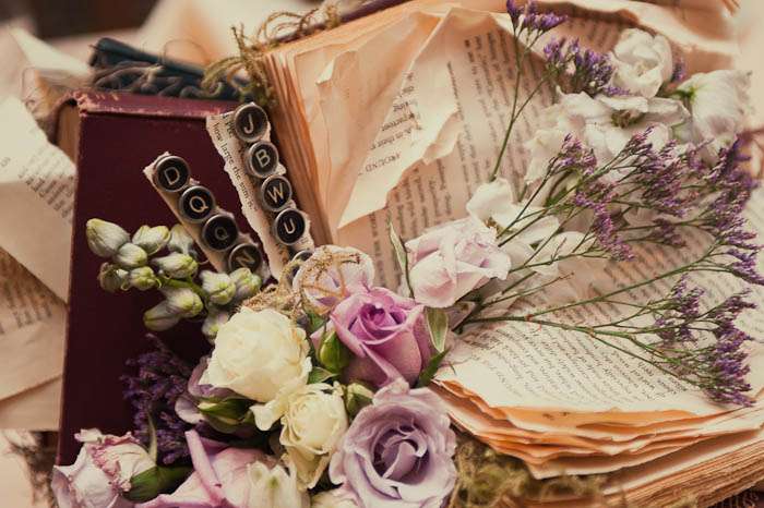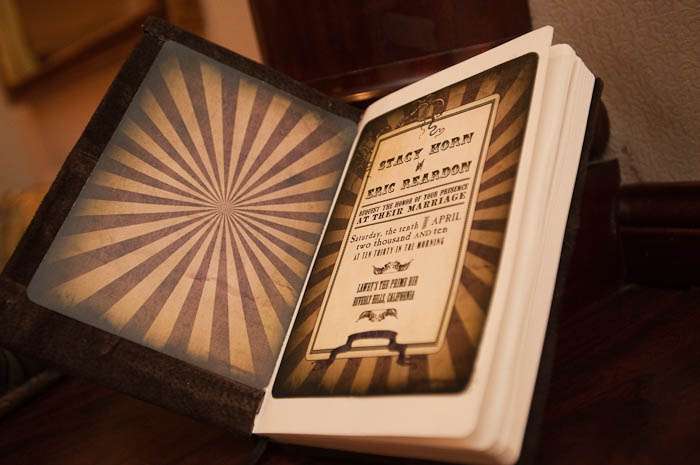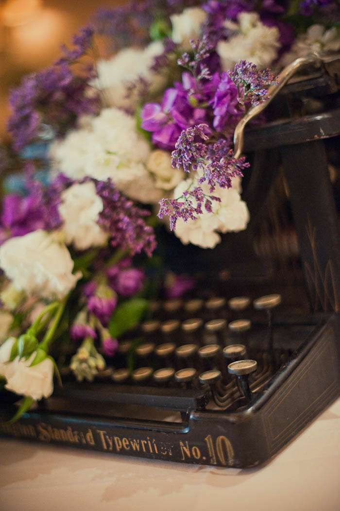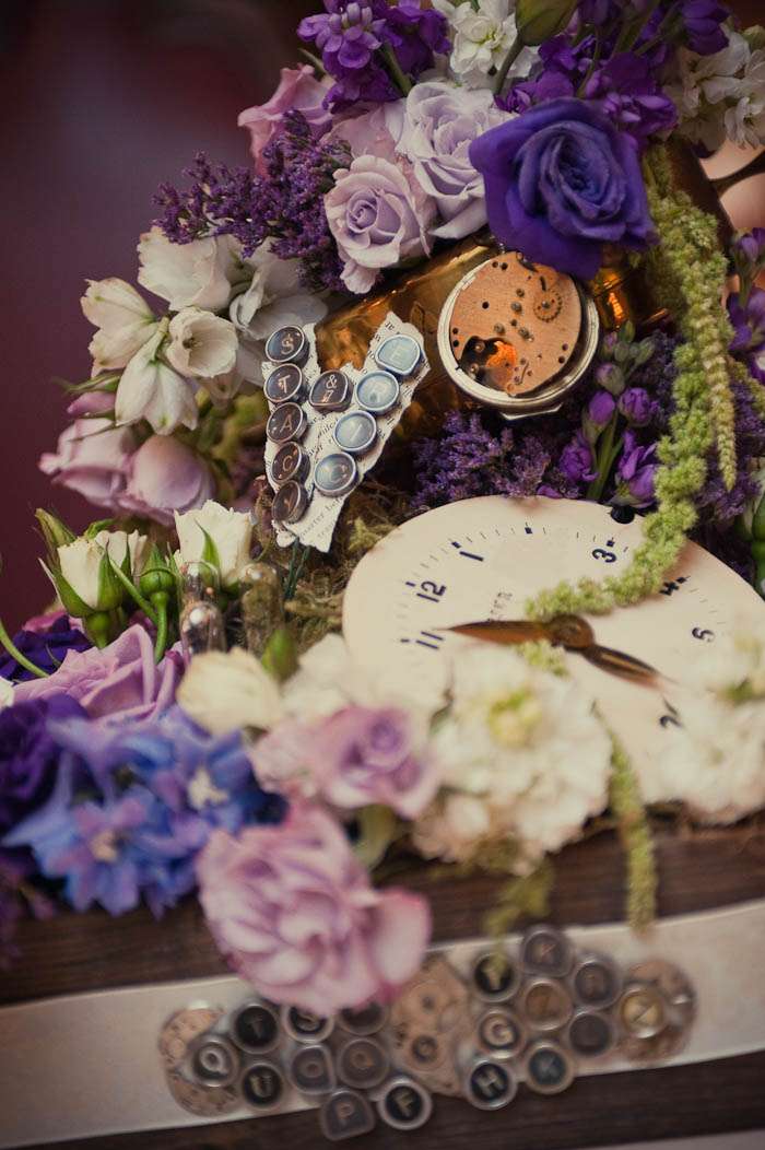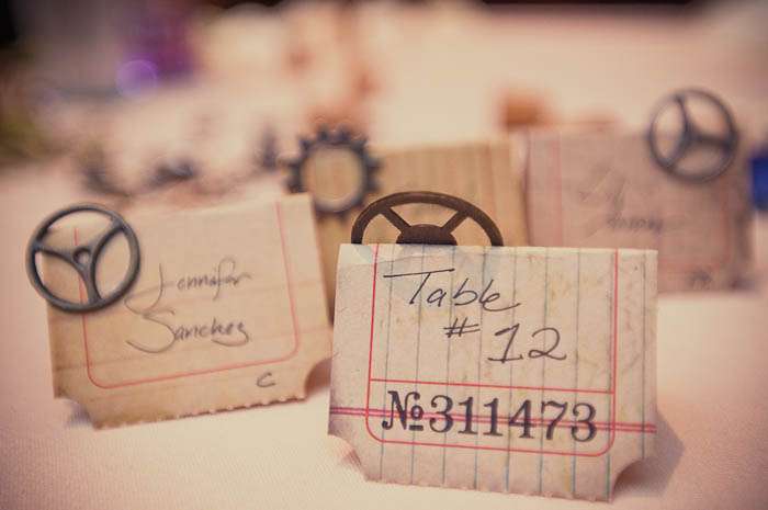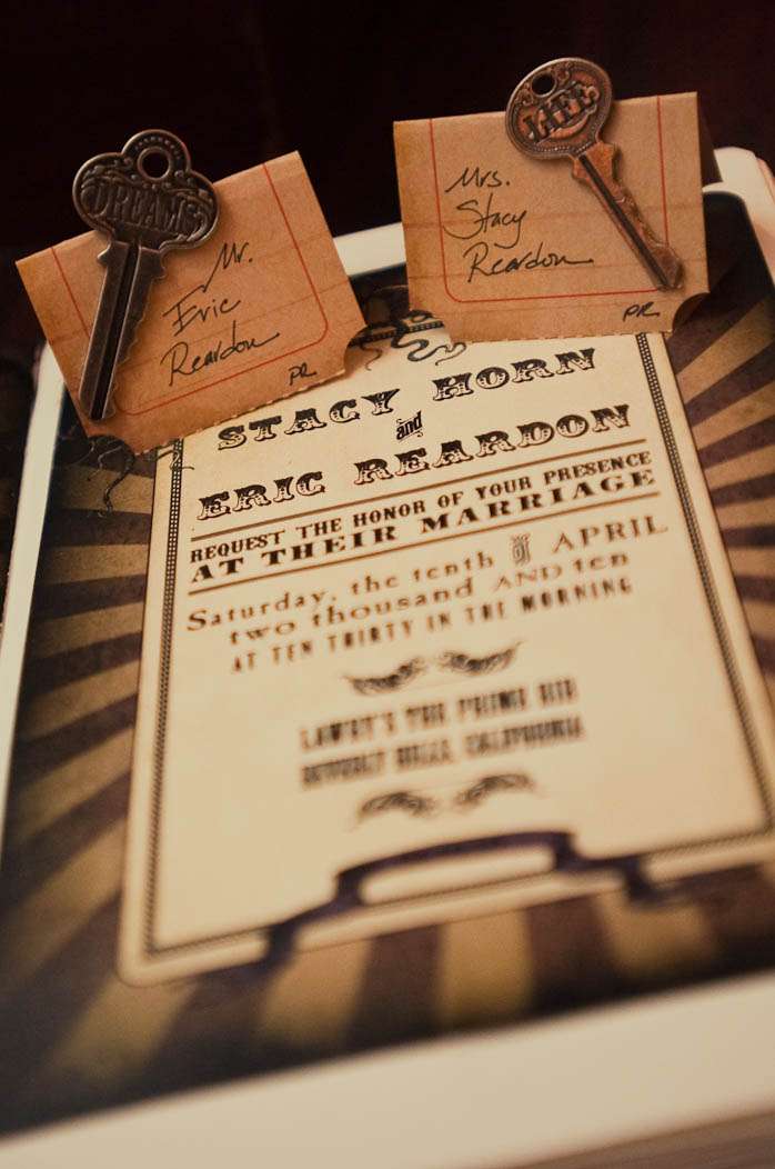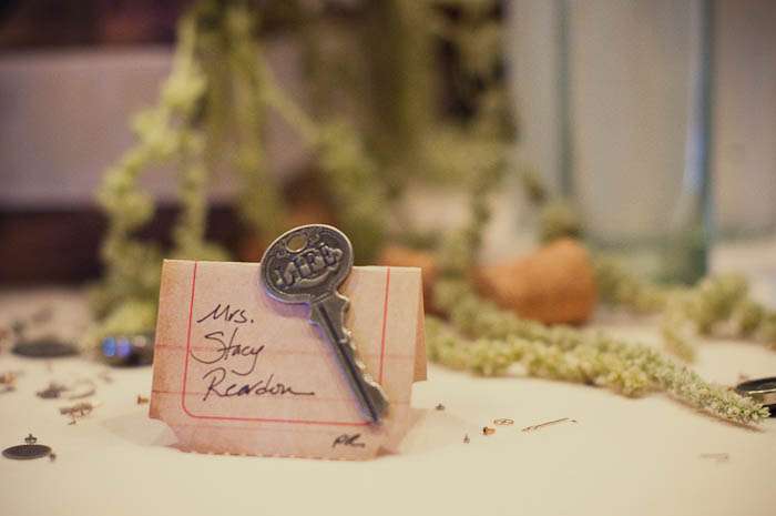 Stacy & Eric got married in April and had one of the most incredible weddings fitting this theme that I have ever seen! The whole wedding was filled with circles – from old type writers, clocks and top hats to that truly incredible (and fully edible!) cake (made by Let Them Eat Cake in California – seriously go check out their website, they have cakes and designs like you’ve never seen before!) You are going to go nuts for these details – I am loving the typewriter/flower combo. It’s like nothing I’ve ever seen. The centrepieces consisted of flowers, old books books, typewriters, gears, light bulbs, test tubes and had a real authentic Steampunk vibe. Stacey collected all the props throughout their planning and then gave them to florist Debbie Fields who put everything together on the day. The place names, which were made of old-looking train tickets (found at a craft store) had individual keys stuck to them that with significant words on them like ‘life’ and ‘dreams’. The keys and gears on the place cards were found at a local craft store-they come from a scrapbook line by a guy named Tim Holtz (you can buy everything though his online store too – bonus!)
