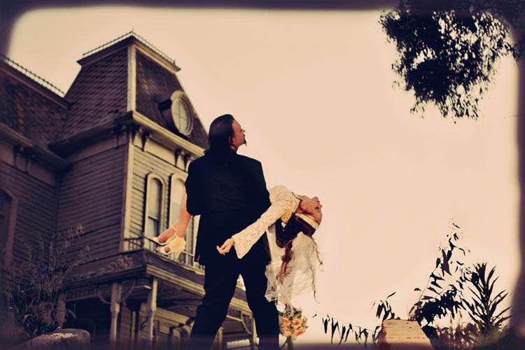 This year is 50 years since Psycho terrified audiences all over the world and the film-loving couple thought that the very house that the movie was filmed it would make the perfect location for their wedding. It was the first ever wedding held at the Psycho House. The pair really went all out with their theme which started when and the groom appeared from the House escorted by none other than Norman Bates as Mother. He descended the famous staircase and the bride entered from Janet Leigh’s room #1. The recessional ended with Robert carrying Suzi back to the hotel under the watchful eye of Norman Bates.